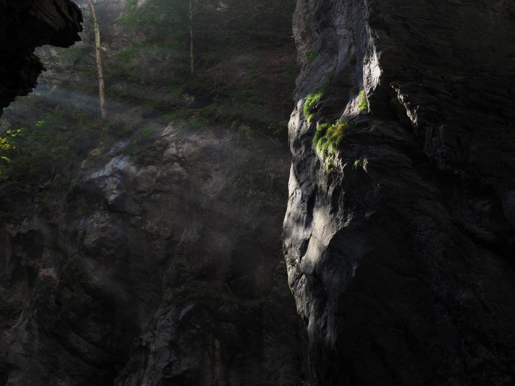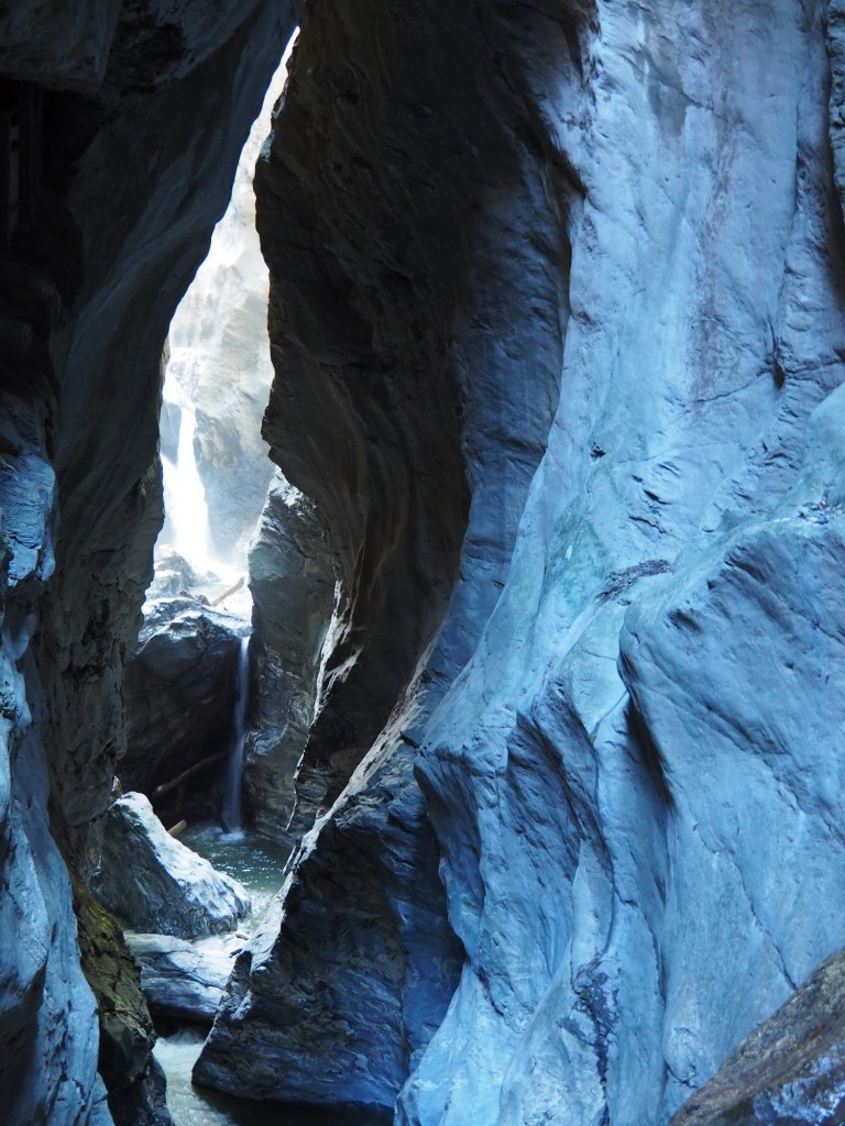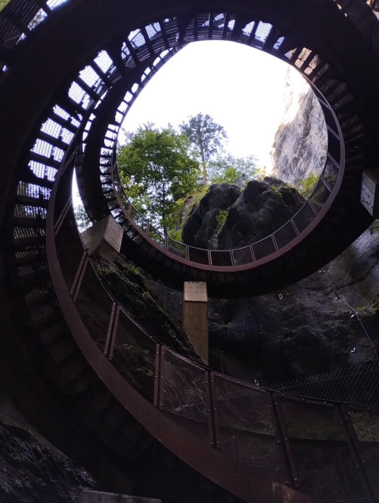 Berníka bolela noha, takže to bylo dost náročné. Nevěděli jsme, jestli to přehrává nebo ho noha fakt bolí. Na pokladně jsme koupili lístky a přes turniket vešli dovnitř na trasu soutěsky. Prošli jsme nějaké tunely a schody, všude okolo burácela voda z horského potoka a byla to nádherná podívaná. Pak jsme se ocitli u ikonických točitých schodů.