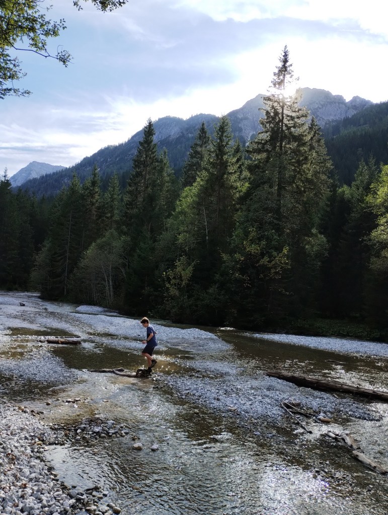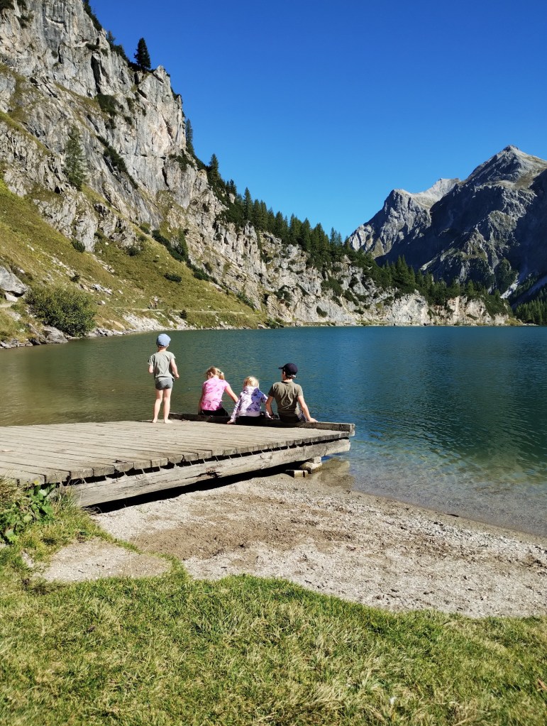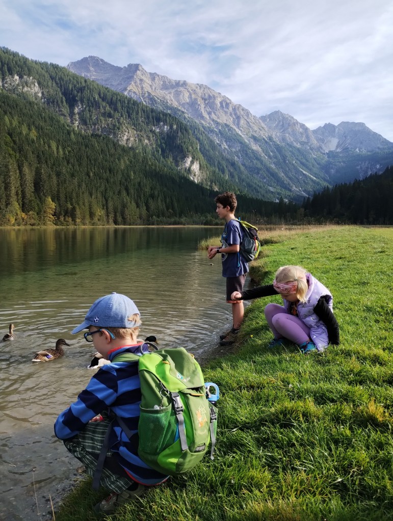 Sundali jsme boty a ponožky a šli otestovat vodu v jezeře. Byla opravdu ledová, ale krásně průzračná. My dospělí jsme pak odpočívali na břehu a děti si hráli u vody. Nejvíce je bavilo házení žabek.