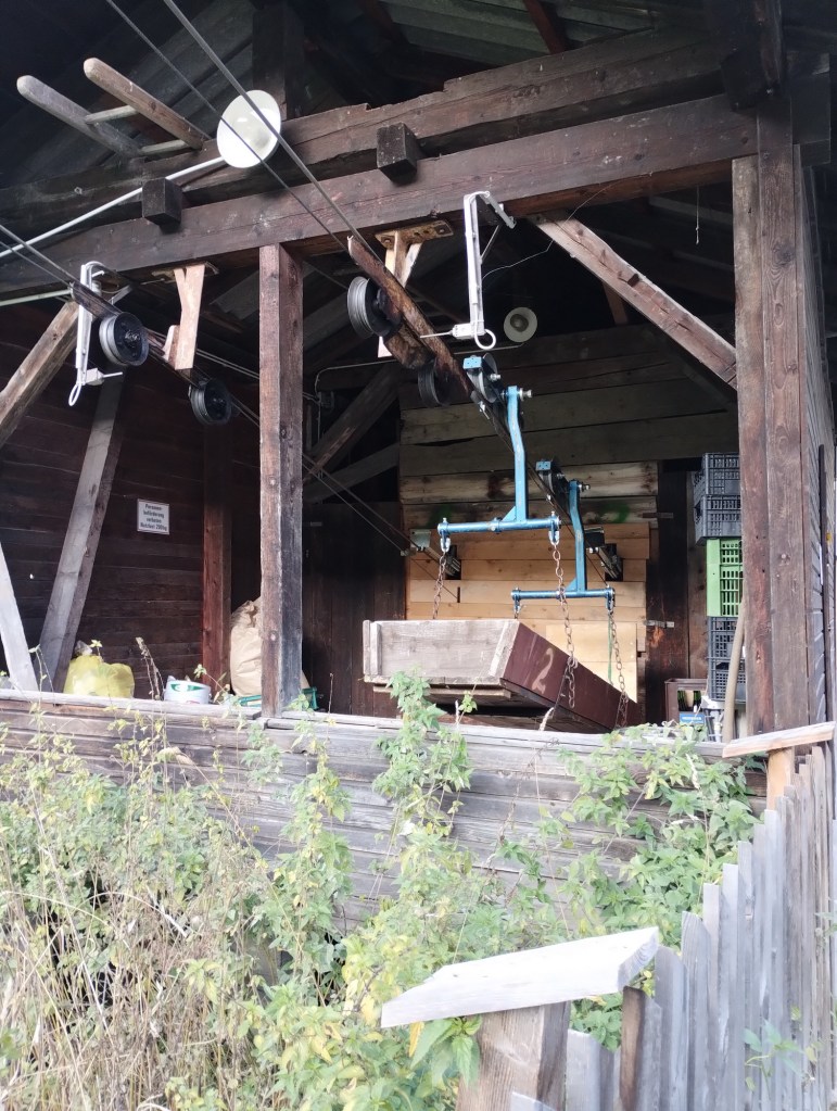 Na pokoji jsme uvařili oběd a po pozdním obědě jsme se rozhodli vyrazit ještě odlovit nějaké kešky a taky se podívat do městečka. Při hledání mostu přes řeku jsme objevili úžasnou nákladní lanovku. Po tom, co jsme objevili most, tak také super značku Pozor lanovka.