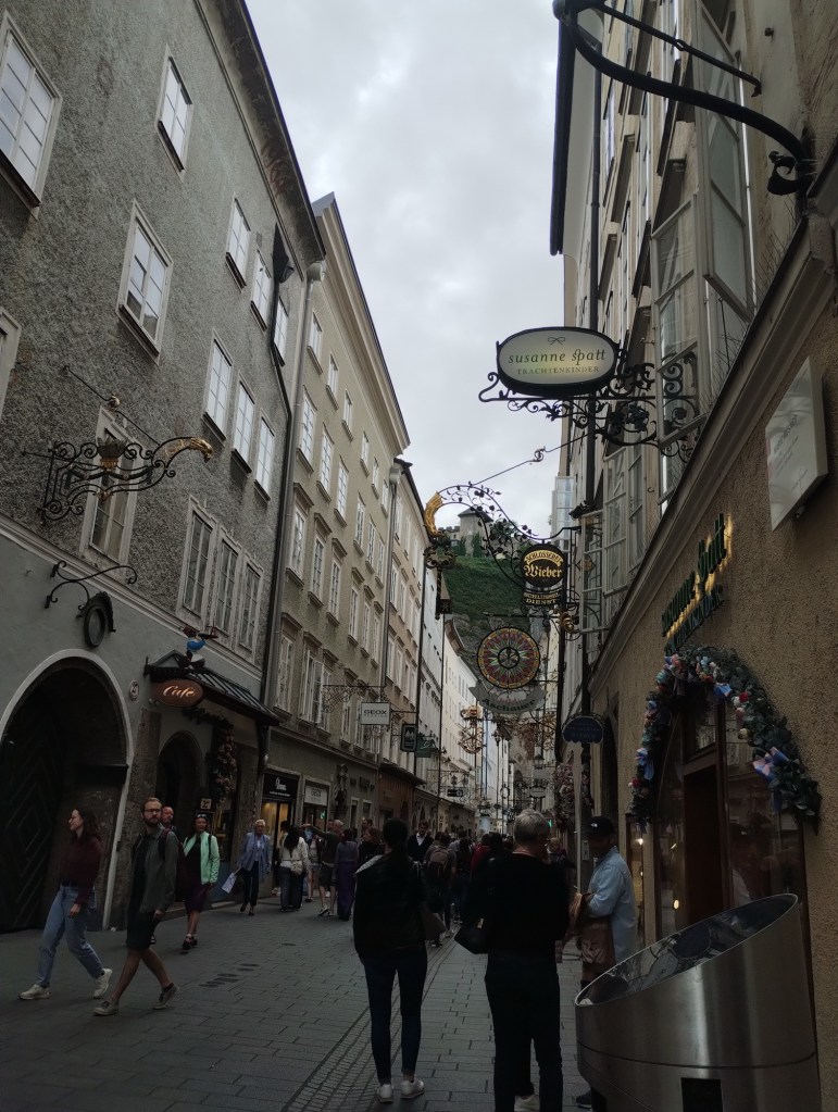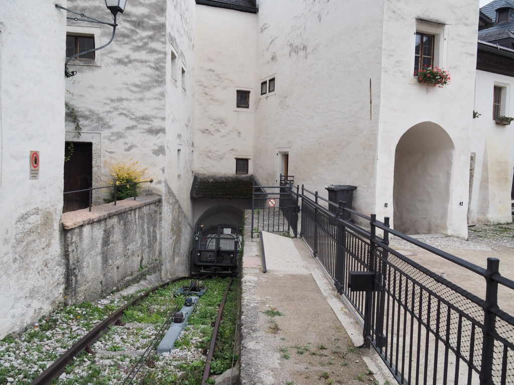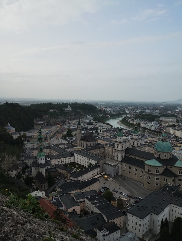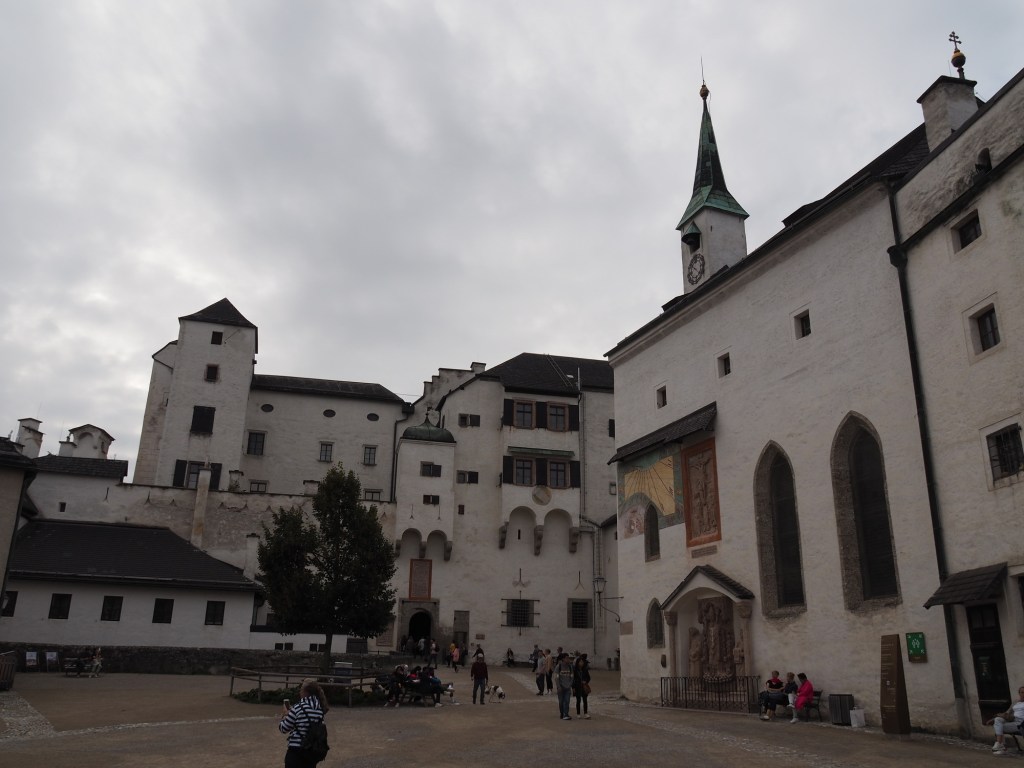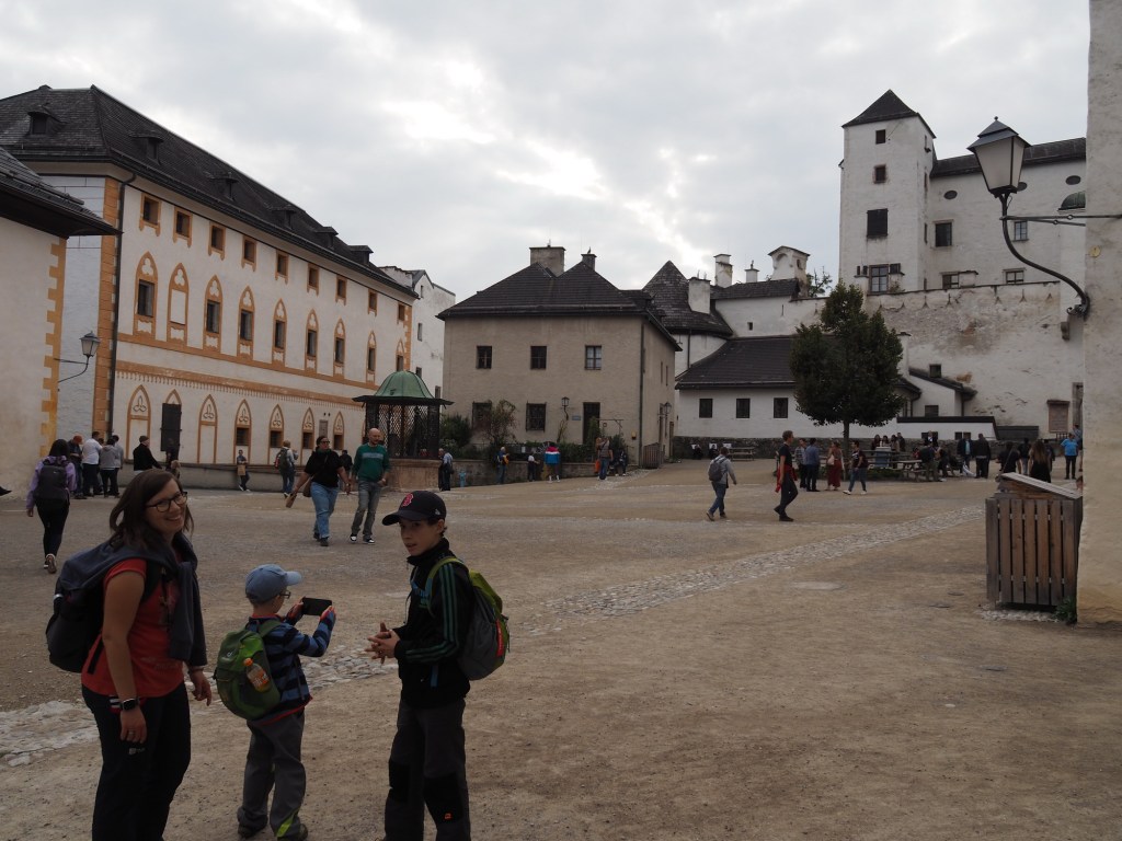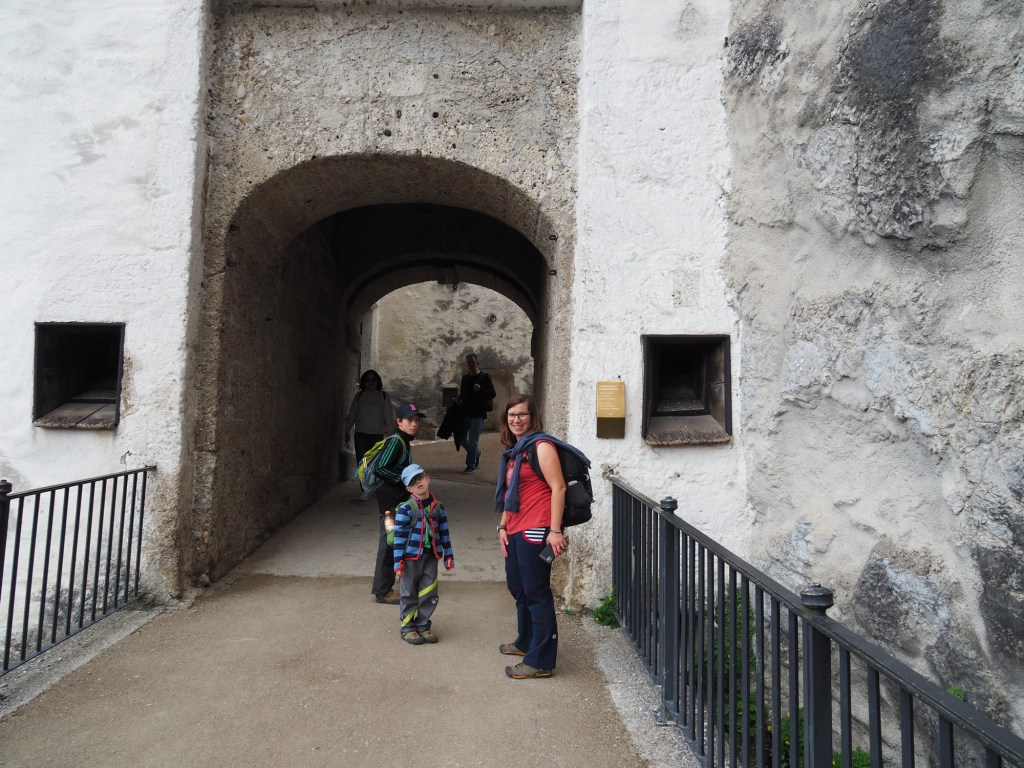 Potom už jsme se šli projít do centra, kde jsme se zase potkali i s Luckou a její rodinkou. Při procházení po městě Míša objevil sushi restauraci, která vypadala moc dobře, takže jsme se na oběd vypravili tam. Dali jsme si různé sety sushi a Samík si vybral nudle se smaženým kuřecím. Moc jsme si všichni pochutnali a nacpali si bříška. Lucka s Tomášem už chtěli jet domů, ale protože se vyčasilo, tak my jsme naopak chtěli využít odpoledne pro průzkum Salzburgu. Takže jsme se u restaurace rozloučili a vyrazili vzhůru do kopce směrem k Salzburgskému hradu. Cestou jsme minuli lanovku, která vyvážela turisty k hradu, ale přece nejsme žádné béčka. Za 10 minut jsme byli nahoře.