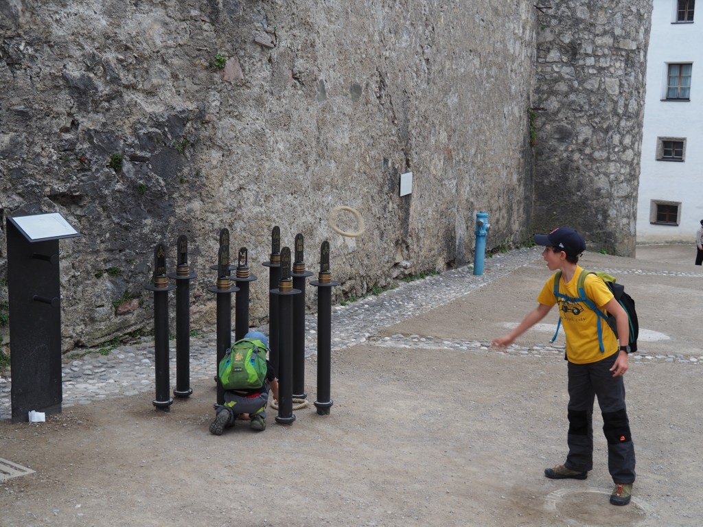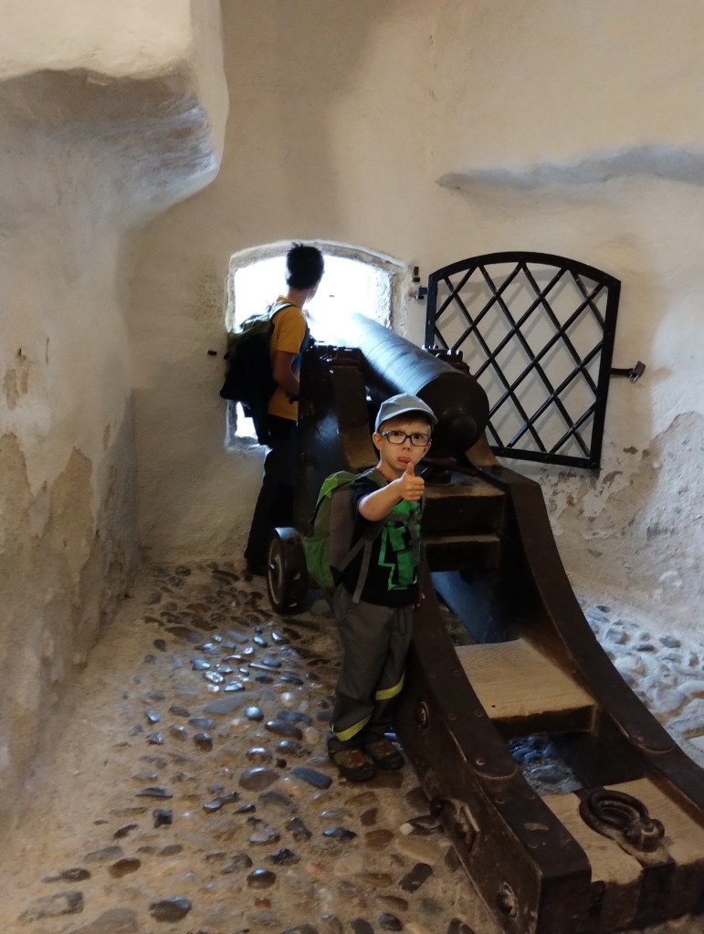 Po krátkém přemýšlení jsme se rozhodli, že si koupíme vstupenky, i přesto, že už bylo 16 hodin. Vybrali jsme kombinaci s lanovkou v ceně, aby si ji kluci užili alespoň dolů. Hrad to byl rozlehlý a my jsme se báli, ať si ho stihneme prohlédnout celý do zavíračky. Prošli jsme si venkovní a moc krásné vnitřní prostory. Na chvilku jsme si připadali, že jsme se přenesli o pár desítek let zpátky. Vnitřní expozice byla věnována období 1. světové války a my tam našli spoustu odkazů souvisejicích i s Českem.