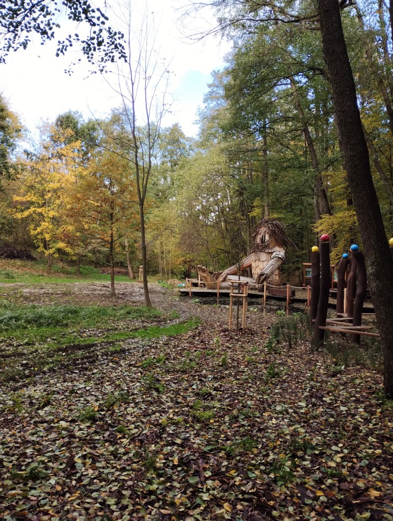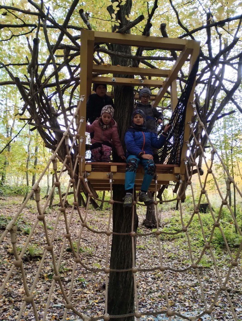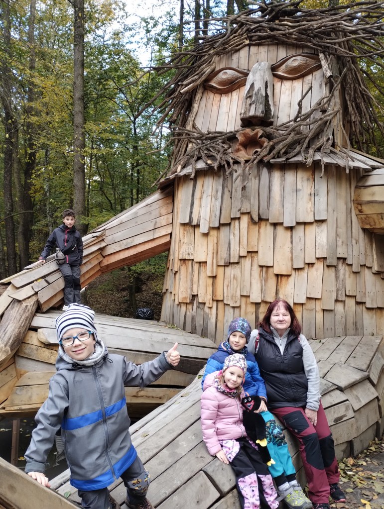 Po výborném obědě u babičky jsme vyrazili ke Kolibě, kde jsme měli sraz s Mončou, Domčou a Beky. Za Kolibou vedly krásné nové schody dolů ke studánce, kde jsou vybudovány priessnitzovy chodníčky ve vodě. Nikdy jsme ale nenašli odvahu je vyzkoušet. Pak nás Beky po dřevěné lávce vedla dál k rybníku s kačenkami, protože cestičku znala z procházek ze školky. A opravdu jsme za chviličku byli tam. Stezka dál pokračovala až k obrovskému dřevěnému obrovi, za ním pak byl hadí chodníček a stromový bunkr. Ten jsme potkali po pár desítkách metrů ještě jeden. Zanedlouho pak chodníček skončil a my pokračovali lesem až k začátku křížové cesty, podél které jsme došli až k pramenu a soše panenky Marie. Pak už jsme se vydali zpátky směrem k bývalým kasárnám v Bělském lese.