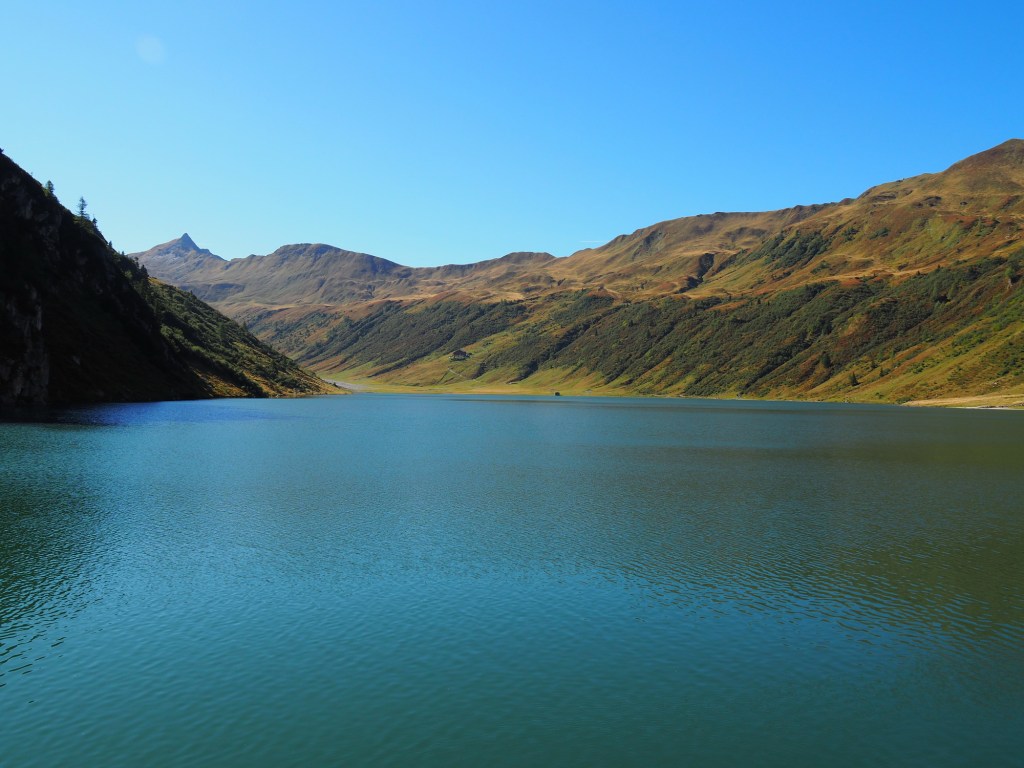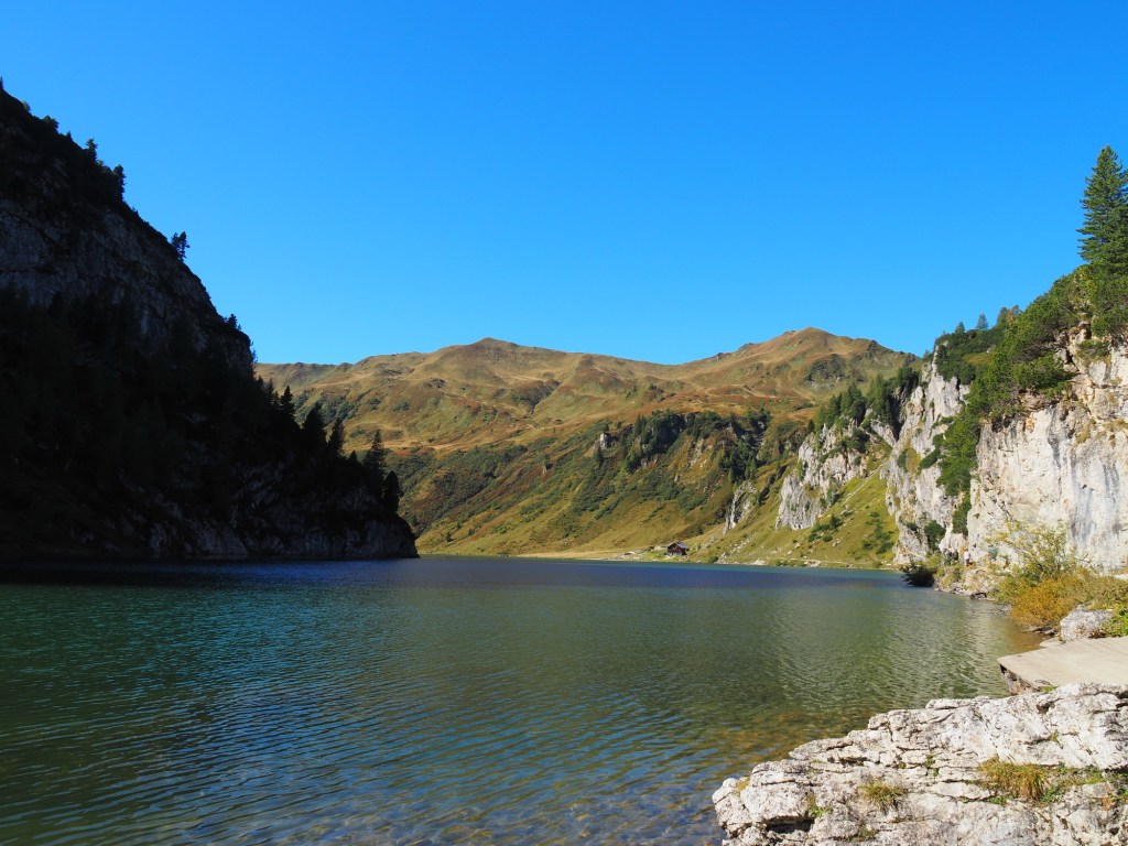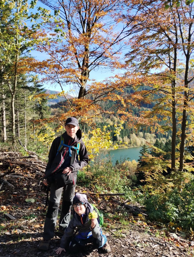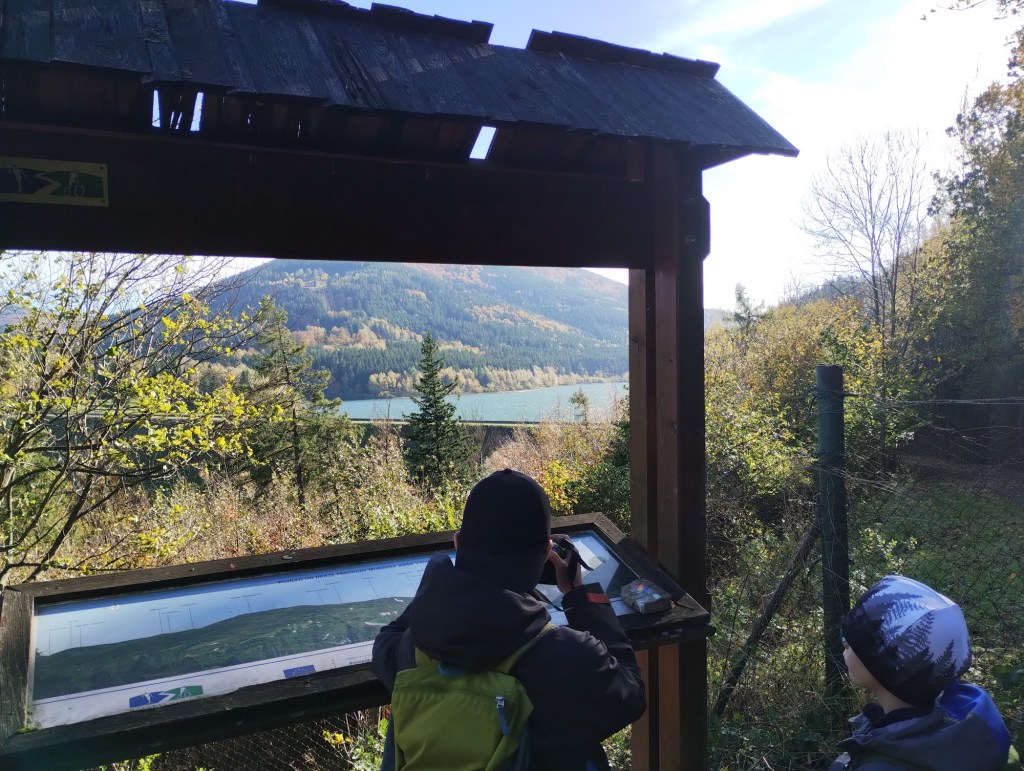 Cesta pozvolna stoupala serpentinami vzhůru a s každou zatáčkou se nám rozprostíraly hezčí a hezčí výhledy. Děti statečně šlapaly vzhůru, dokonce ani Berník si nestěžoval na nožku a cesta opravdu svižně utíkala. Občas jsme si dali krátkou přestávku na lavičce, ale zhruba za dvě hodiny stoupání jsme byli odměněni nádherným výhledem na horské jezero. Kluci už chtěli sundávat boty, ale nakonec jsme je přesvědčili, ať dojdeme ještě k horské chatě. Ta byla bohužel zavřená a chyběl i symbol zdejšího jezera – vycpaný svišť.