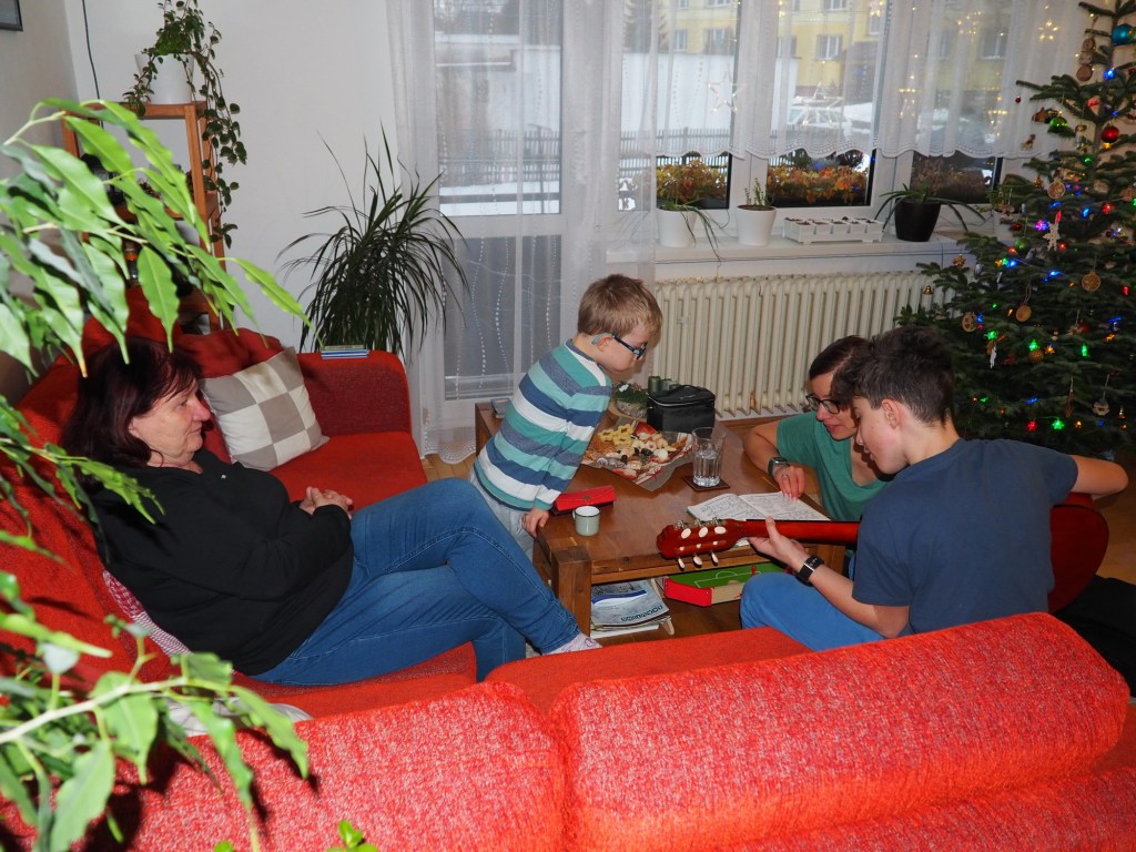 Na Štědrý den ráno jsme posnídali tradiční domácí vánočku, jejíž kynutí a pečení bylo předešlý večer trochu dobrodružné, protože na hodinu a půl vypadla elektřina. Ale nakonec se výtečně povedla a my si na ni mohli pochutnat. Pak jsme jeli vyzvednout babičku Irču do Ostravy a cestou domů jsme se zastavili na hřbitovy zapálit svíčky dědovi Mirkovi a dědovi Standovi.