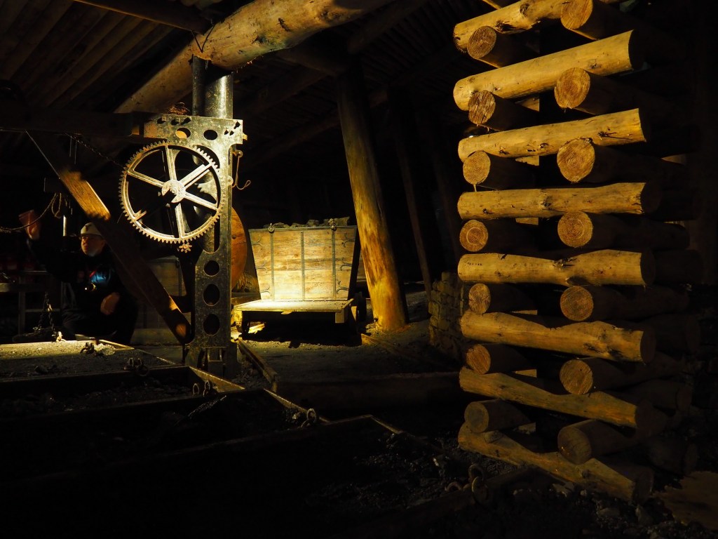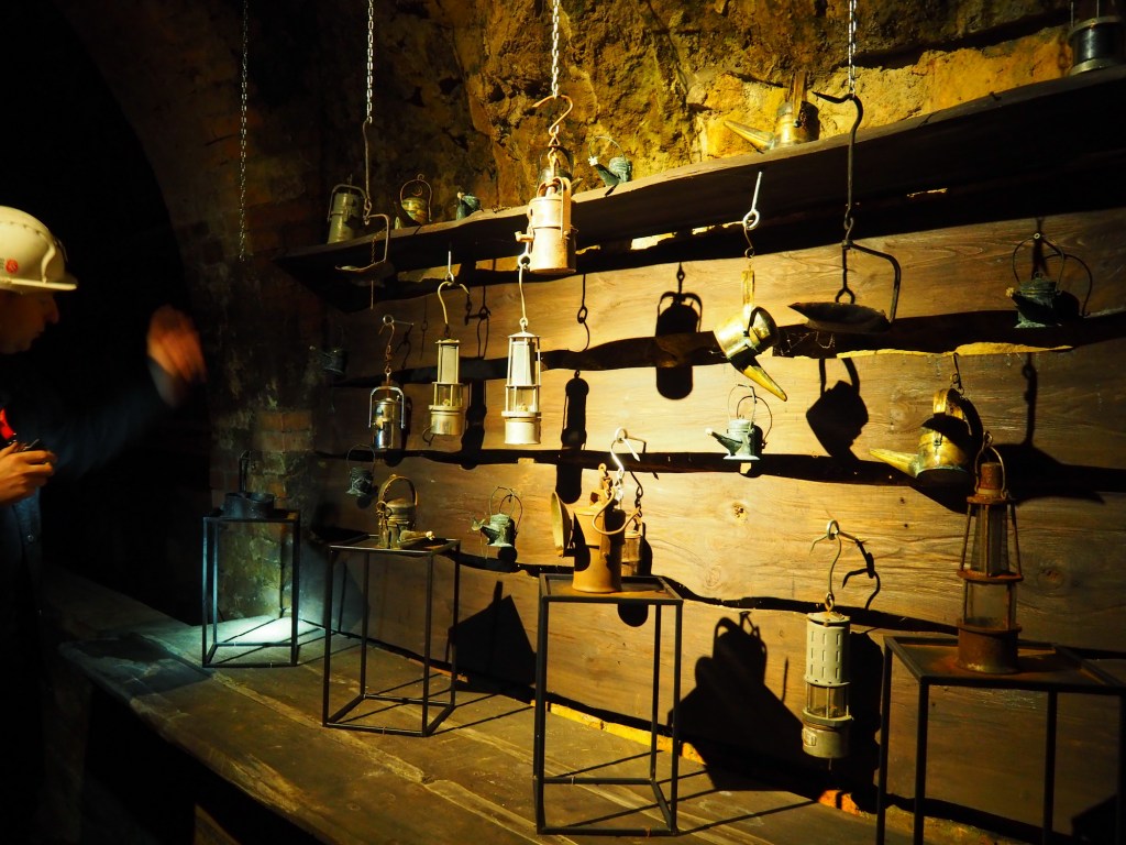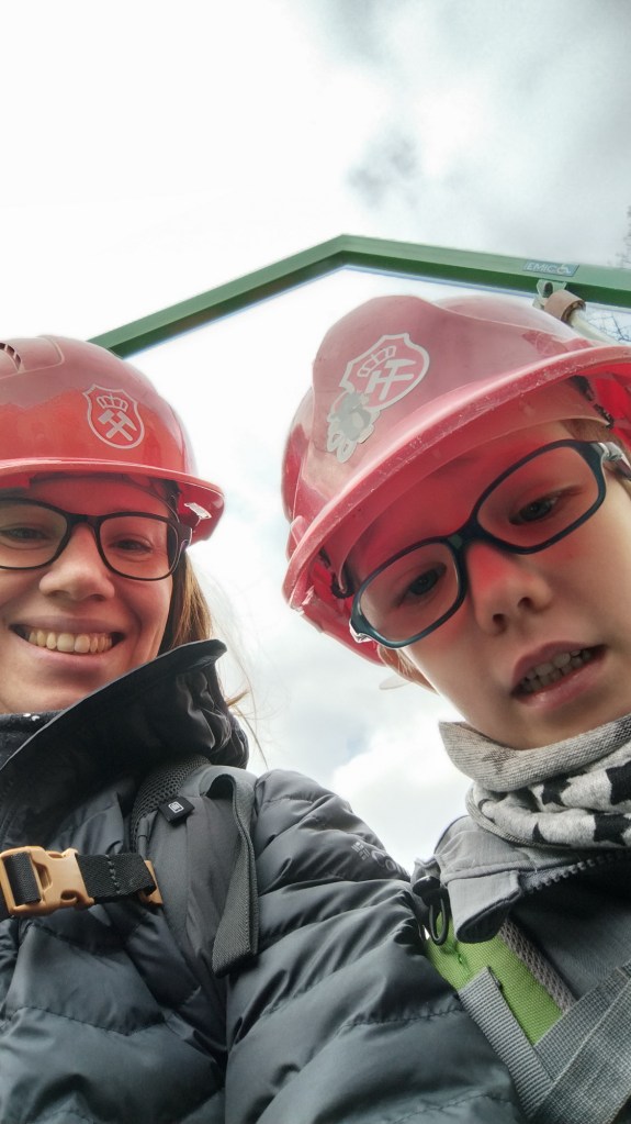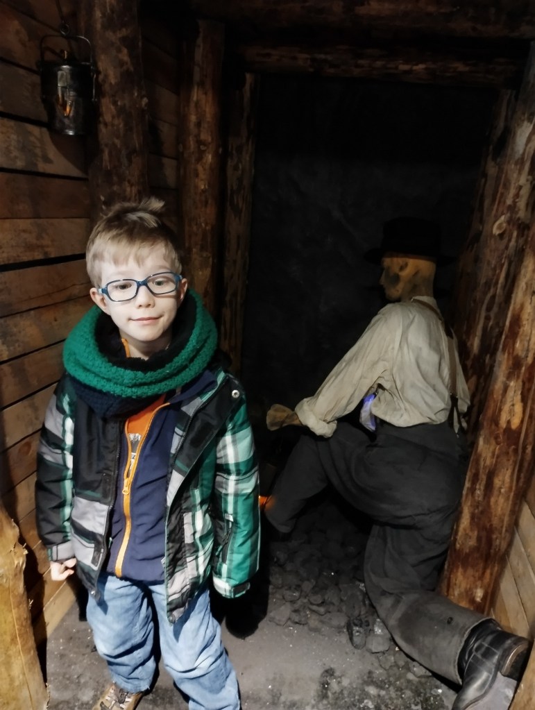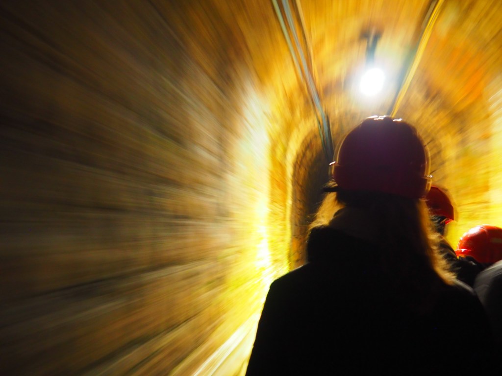 Průvodce nám udělal krátké bezpečnostní školení a vyrazili jsme autobusem přes město na začátek trasy. Tam jsme vyfasovali helmy a nalodili jsme se na důlní lodičku. Půl hodinu dlouhou plavbu průvodce vyprávěl o tom, jak to kdysi byla těžká dřina svážet uhlí na lodi ven z dolu. Docela jsme rozuměli, bohužel jsme nestíhali klukům moc překládat, ale vypadalo to, že jim to moc nevadí. Po přistání jsme dolem pokračovali pěšky a zase se dozvídali spoustu zajímavých, vážných i vtipných informací. Zažili jsme simulovaný odpal a na závěr nás na povrch vyvezl důlní vláček.