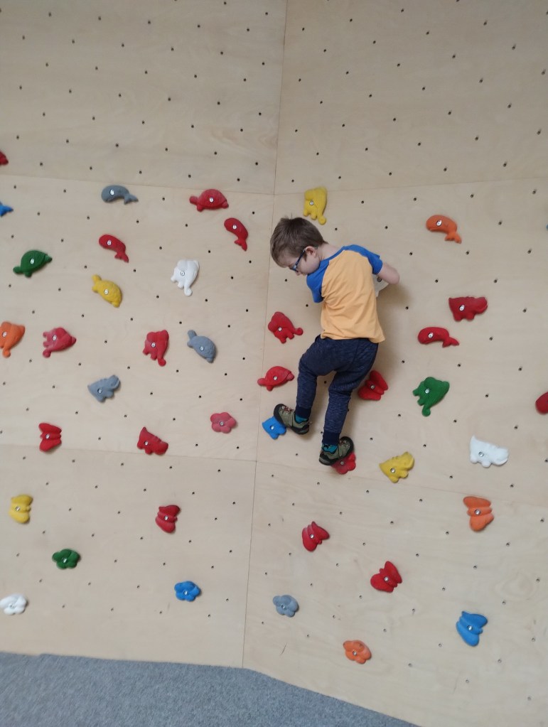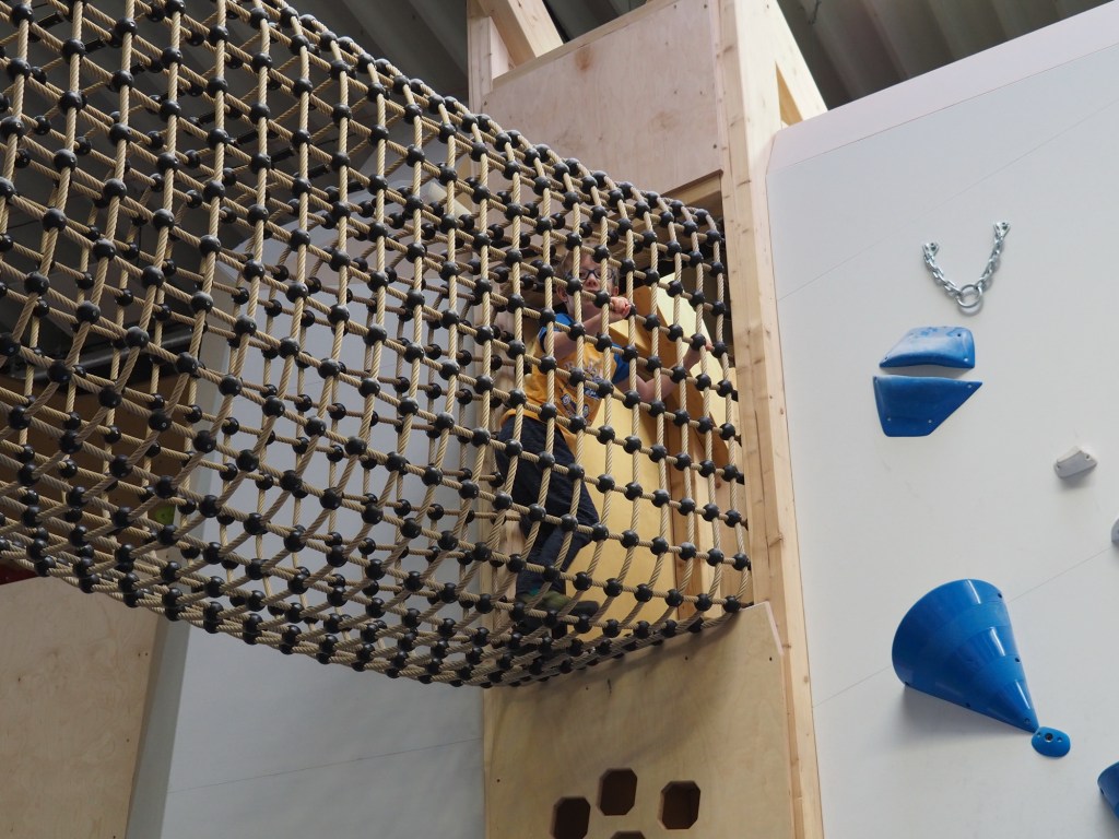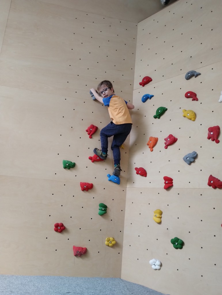 Berník okamžitě vyrazil do dětského kouktu, kde začal prozkoumat vše, co tam bylo. Kluci s Míšou vyrazili zkoušet ty jednodušší cesty. Bernášek si v koutku našel kamarády a moc si to tam užíval. Vyzkoušel dětské stěny, šplhací věž, kruhy, obrovskou žíněnku, kde předváděl kotouly a salta. My jsme se u něj s Míšou střídali, takže se mi taky povedlo pár nejjednoduších cest vylézt. No, je to teda pěkná makačka, přitom když pozorujete někoho jiného, vypadá to dost jednoduše 😀