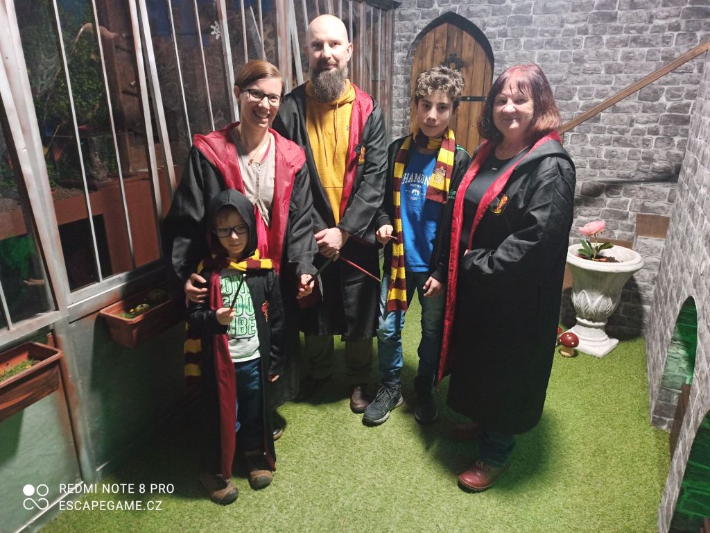 V pátek jsme vyrazili vyrazili vyzvednout babičku Irču a i s ní vyrazili do centra Ostravy za překvapením. Kluci i babička byli napjatí, co je čeká. Jeli jsme do Escapegame v Mariánkách, kde jsme zarezervovali únikovku Škola kouzel. Moc milá průvodkyně nám vysvětlila pravidla a pak nás zavedla na nádvoří čarodějické školy. Vybrali jsme si každý svou čarodějnickou hůlku a to už se za slečnou zavřely dveře a my zůstali v malé místnosti s plánkem školy. Abychom se dostali dál, museli jsme rozlušitit hlavolam. Hurá, povedlo se, dveře otevřeny a my se ocitli v komnatě jako z Harryho Pottera. Příběh je jím hodně inspirován. Postupně jsme luštili všechny hádanky a moc si to užívali.