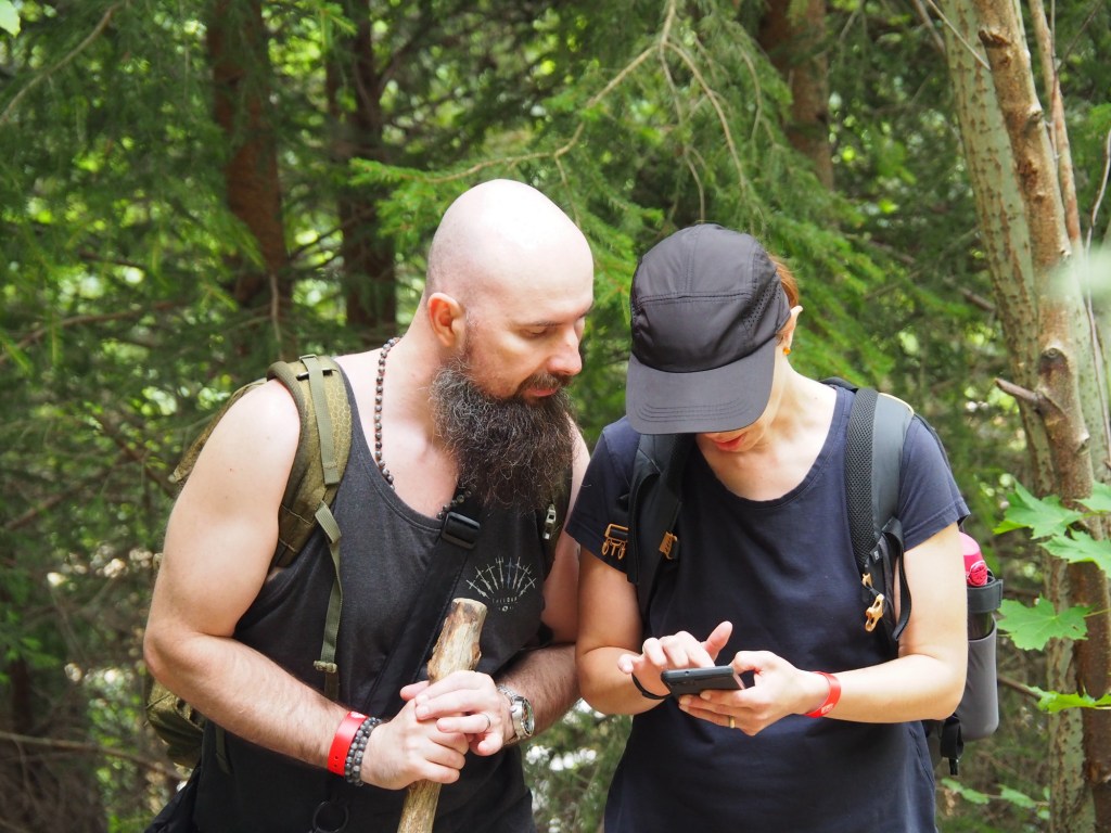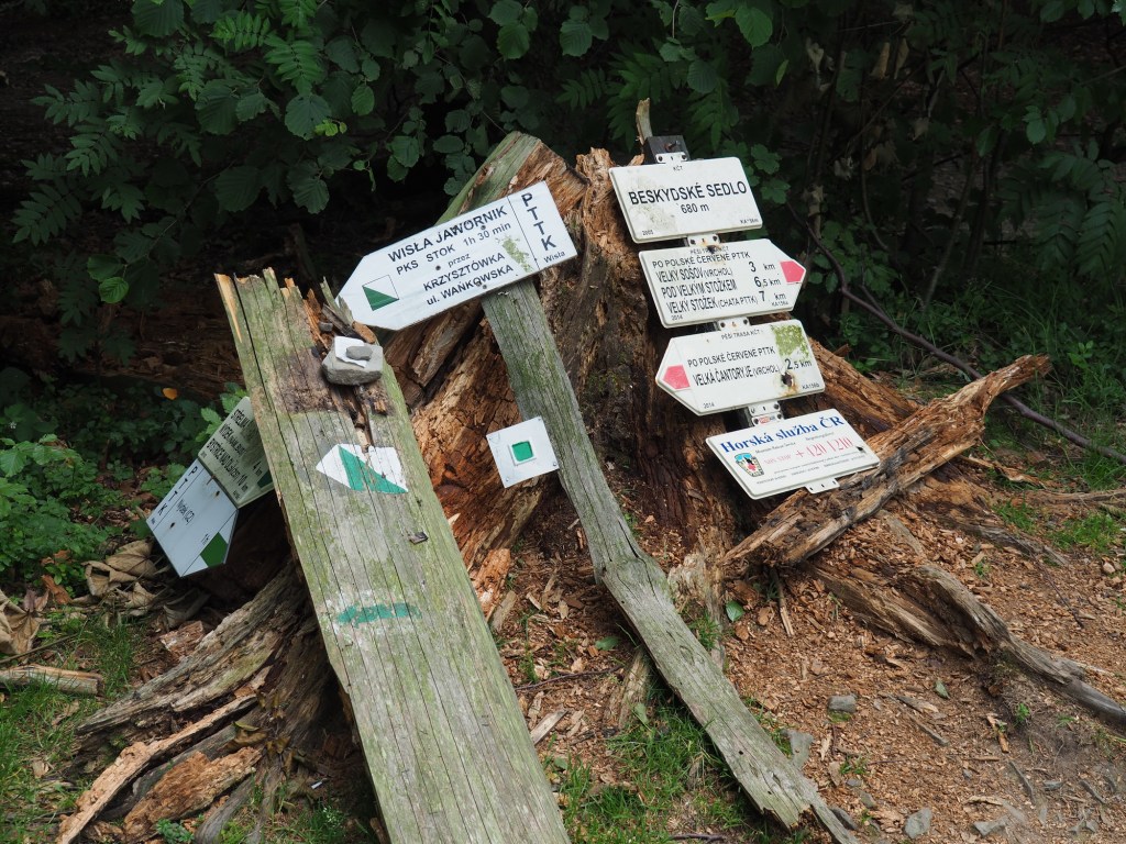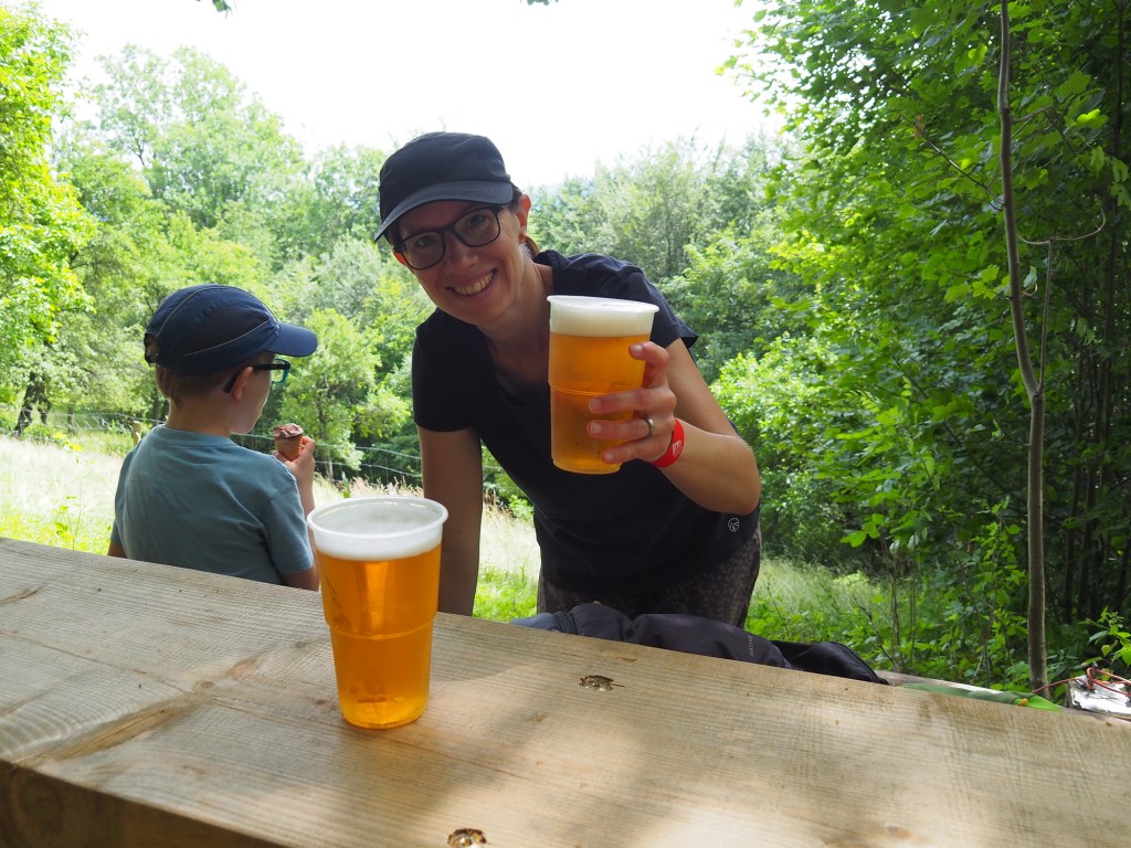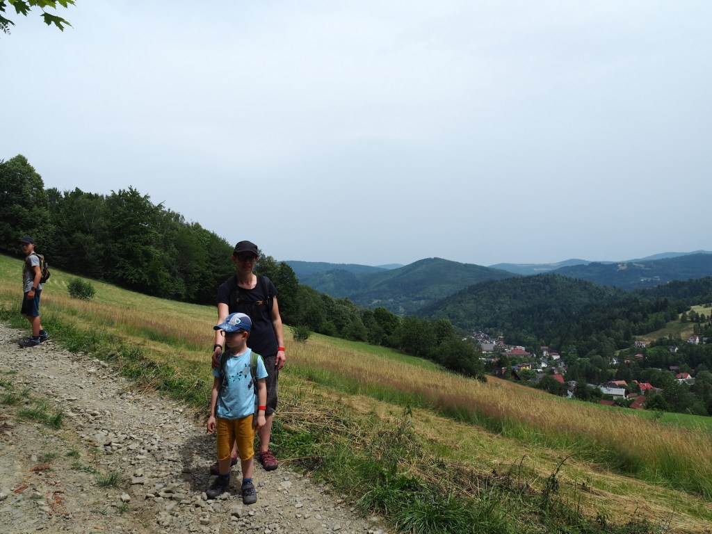 V 11 hodin byl pak pro děti přichystány program – malování zvířátek na dřevo. Bernie šel hned, po chvilce se přidal i Samík a nakonec sebral odvahu i taťka, kterého to bavilo nejvíce a strávil tam pak hodinu. Pak jsme si obuli tenisky a vyrazili na túru. Vymyslela jsem menší okruh, takže jsme vyrazili po modré a pak po zelené vzhůru podél česko polské hranice. Bernie hrozně brblal, stěžoval si na vedro i velký kopec, ale nakonec ho udobřily sladké maliny, které rostly podél cesty. V nejvyšším bodě stoupání na nás čekalo jako zjevení občerstvení. Kiosek uprostřed lesa, to je možné jen v Polsku. Bernie si vybral na posilněnou nanuk, Sam hranolky a my si dali krásně vychlazené čepované pivko. Míša nevěřil, že tady budou čepovat pivo, já nevěřila, že budou brát karty. Ale oboje byla příjemná skutečnost. Po osvěžující pauze jsme se museli kousek vrátit zpátky, protože cesta, kterou jsem původně chtěla jít, byla oplocená.