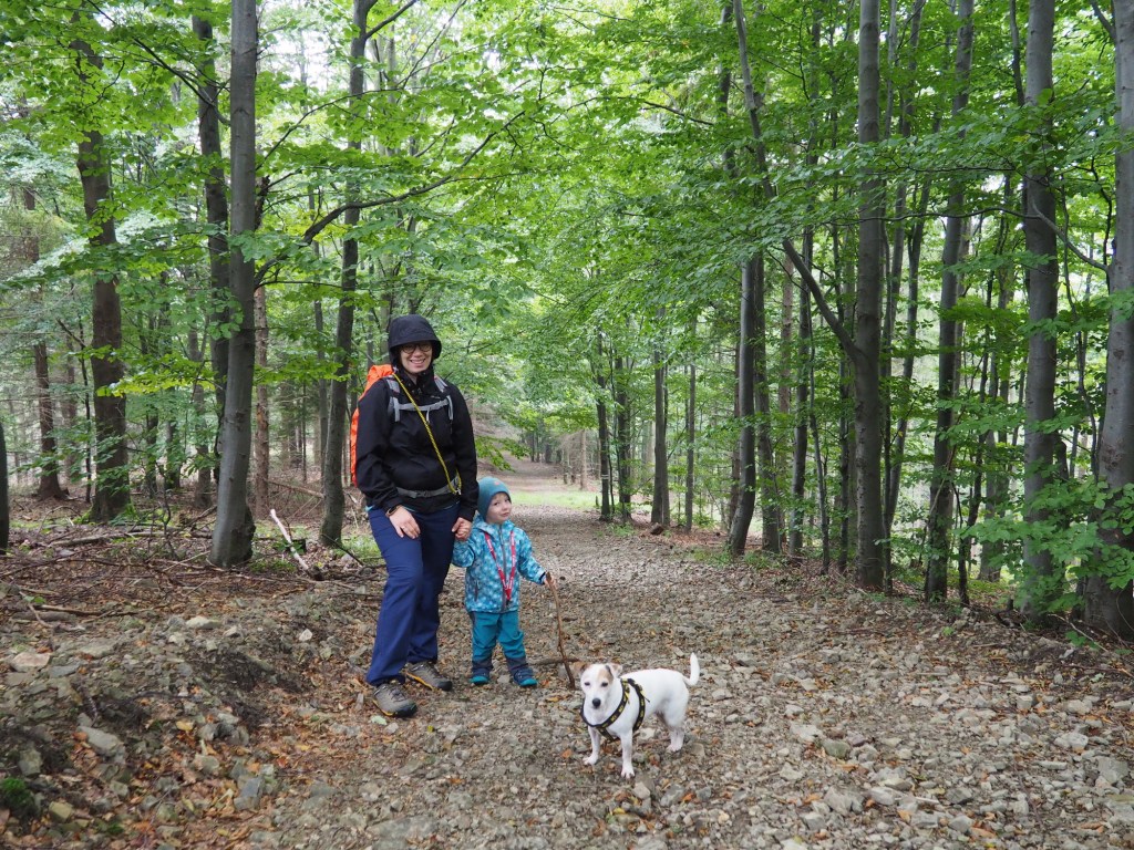 Pak už jsme šli zpátky. Dolů to šlo svižně, Berník šel po svých a ani nám moc nevadilo déšť, jelikož jsme byli krytí korunami stromů. Jen Chilli byla nějaká nešťastná, asi by se radši válela doma ve vaku. Berník vydržel jít celou cestu až na parkoviště a užíval si skoků přes odvodňovací kanály, které protínaly cestu v nepravidelných intervalech.