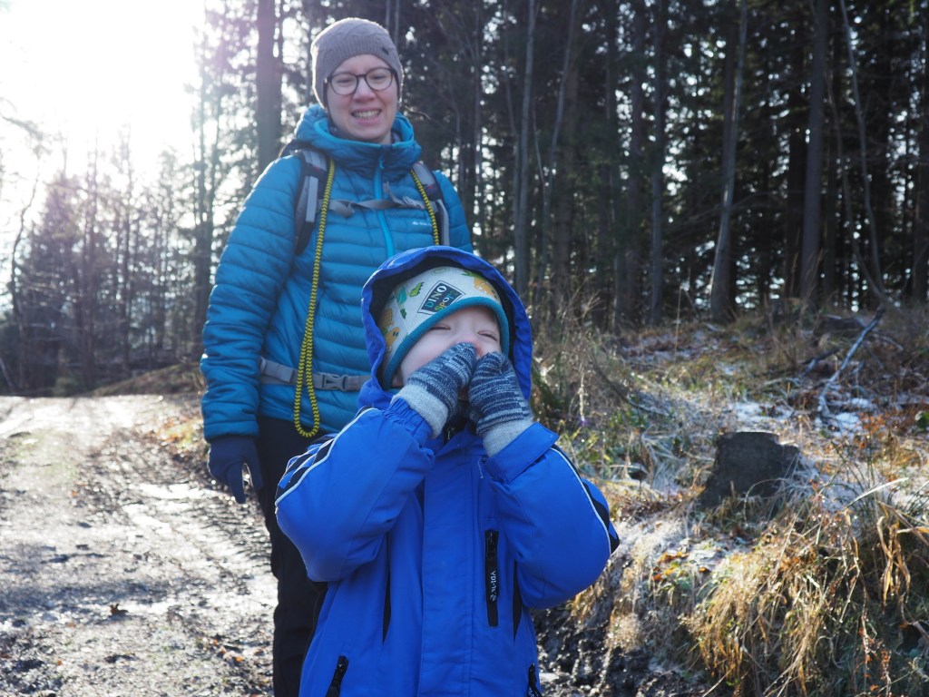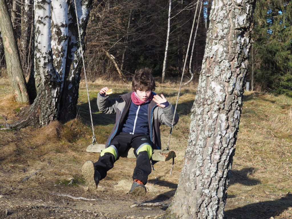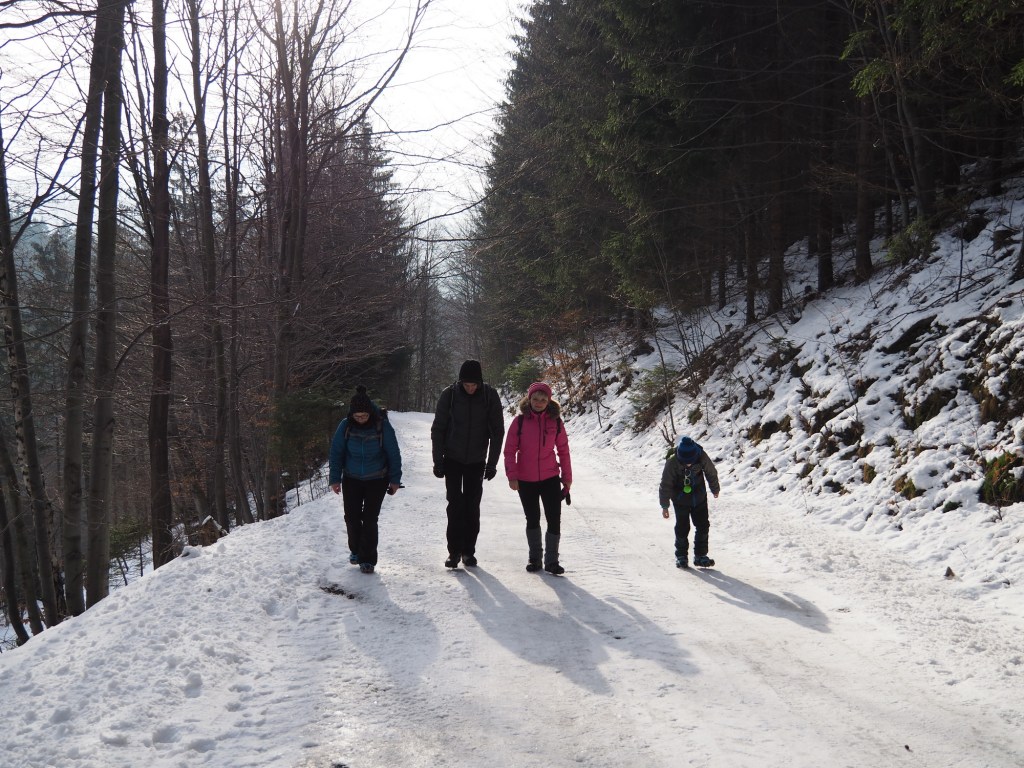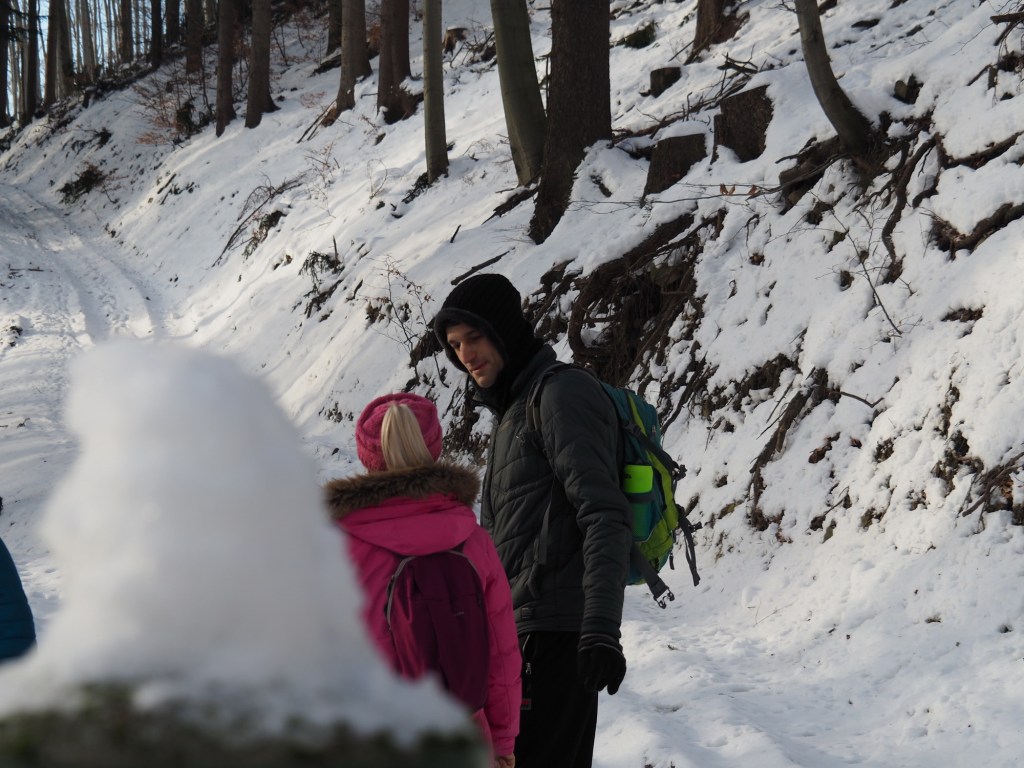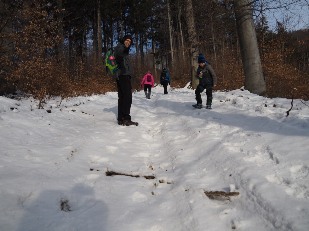 Naplánovali jsme si výlet – 10 km okruh mimo turistickou značku. Vyrazili jsme od domu směr Pražmo, u kříže jsme zabočili k raškovické pile a dále jsme pokračovali kolem řeky. Za loukou už to bylo hodně zledovatělé, takže jsme nasadili nesmeky. Samík byl šťastný, protože jsme pořídili nové a on se nemohl dočkat, až je konečně vyzkouší. První kilometry cesty byly pohodové a vedly po asfaltce. Pak ale mapa ukazovala, že máme uhnout vlevo a před námi byl docela škrpál bez vyšlapaných stop.