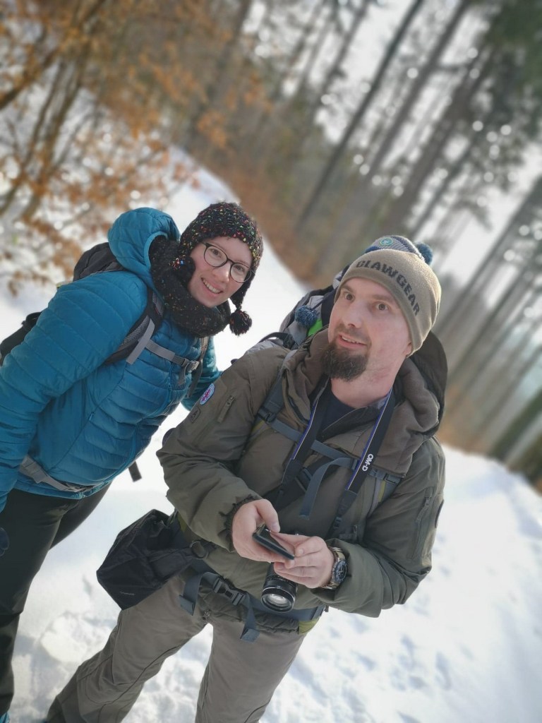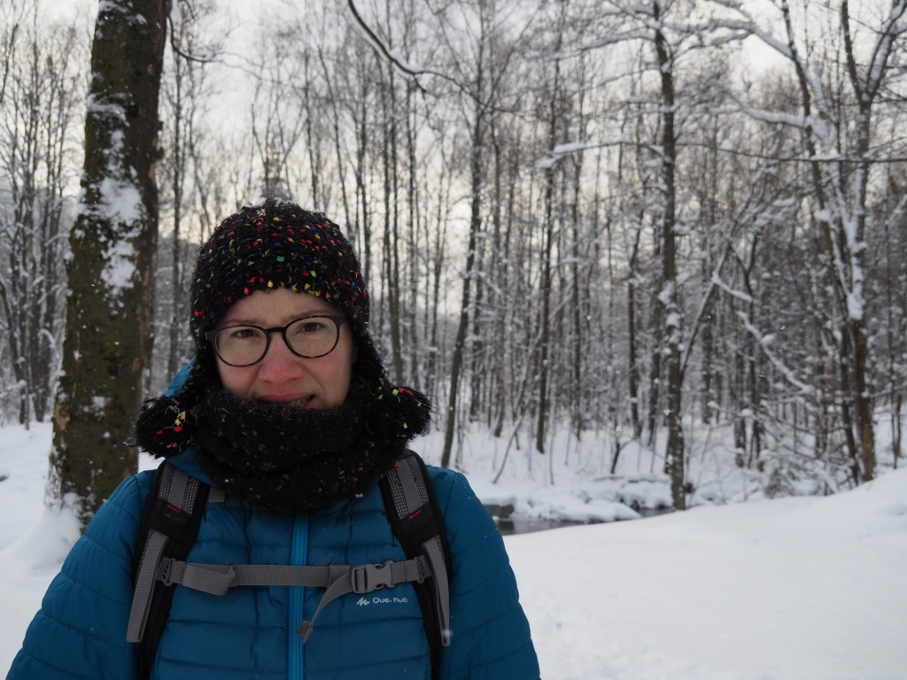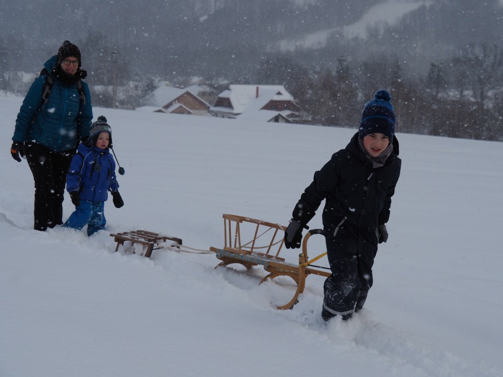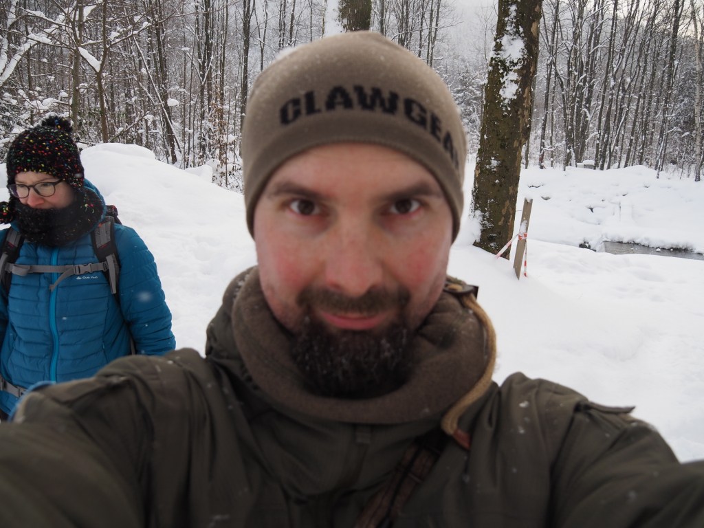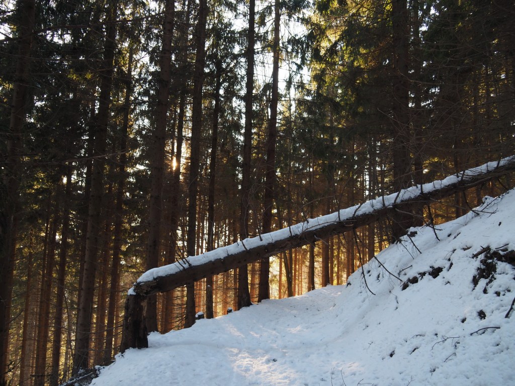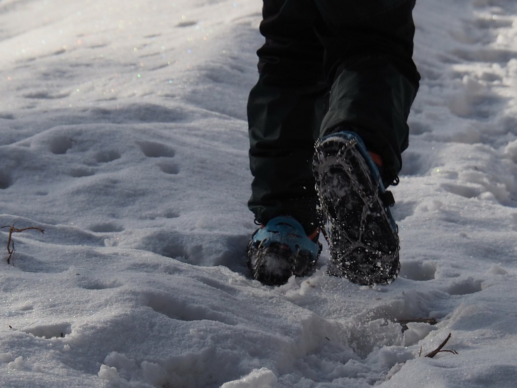 Naplánovali jsme si výlet – 10 km okruh mimo turistickou značku. Vyrazili jsme od domu směr Pražmo, u kříže jsme zabočili k raškovické pile a dále jsme pokračovali kolem řeky. Za loukou už to bylo hodně zledovatělé, takže jsme nasadili nesmeky. Samík byl šťastný, protože jsme pořídili nové a on se nemohl dočkat, až je konečně vyzkouší. První kilometry cesty byly pohodové a vedly po asfaltce. Pak ale mapa ukazovala, že máme uhnout vlevo a před námi byl docela škrpál bez vyšlapaných stop.