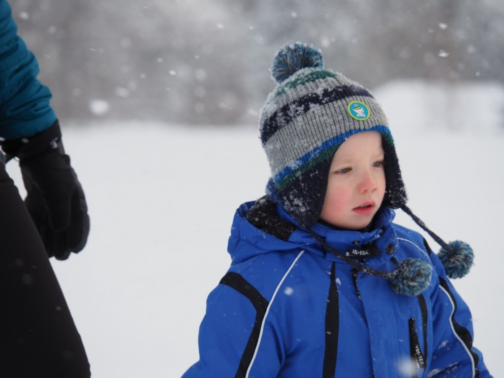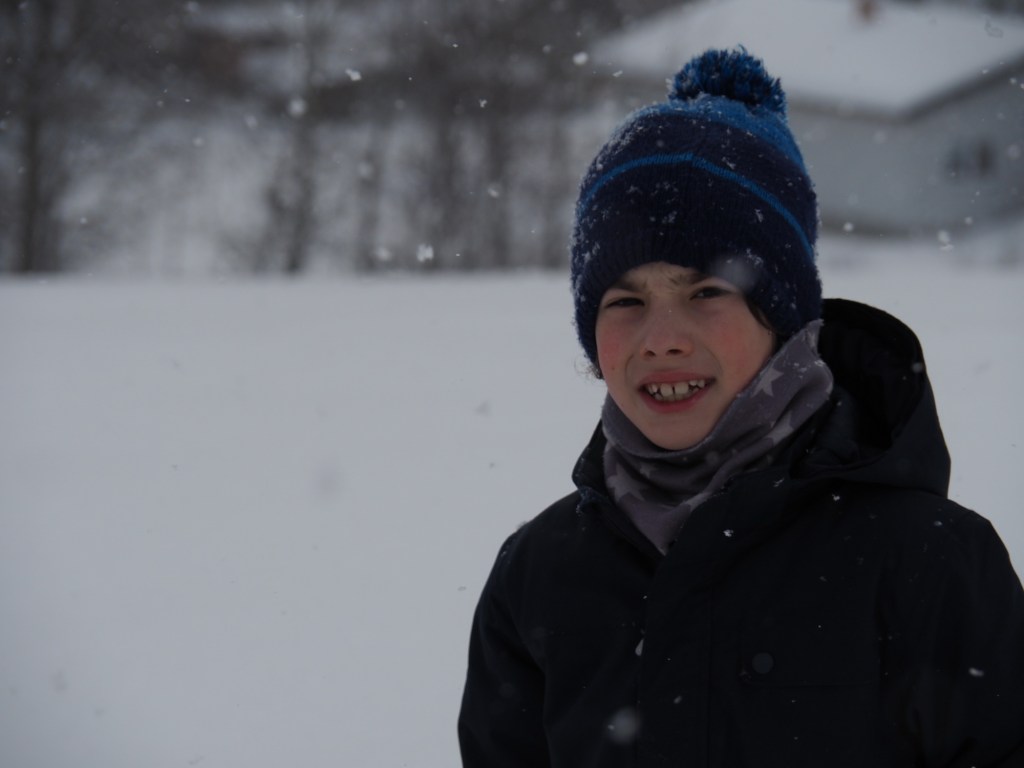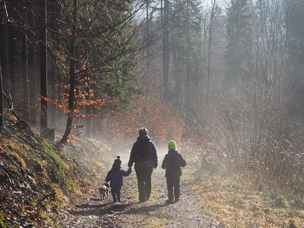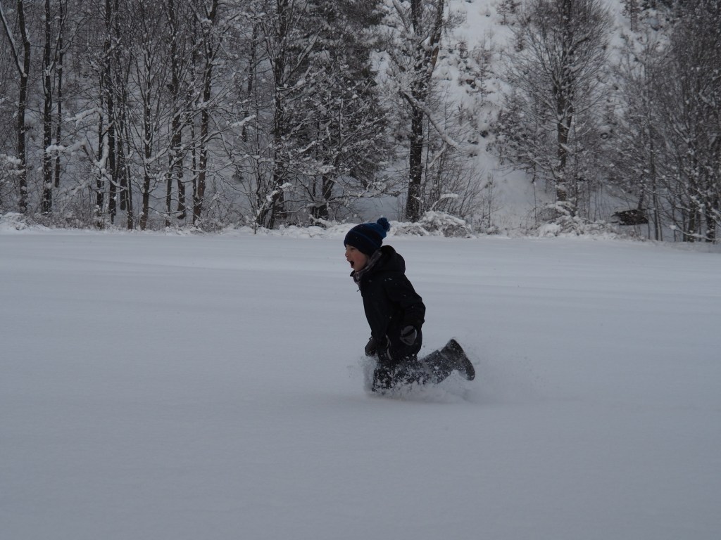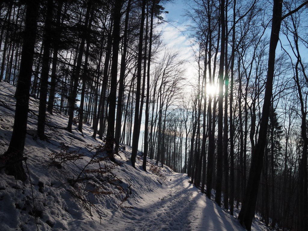 Naplánovali jsme si výlet – 10 km okruh mimo turistickou značku. Vyrazili jsme od domu směr Pražmo, u kříže jsme zabočili k raškovické pile a dále jsme pokračovali kolem řeky. Za loukou už to bylo hodně zledovatělé, takže jsme nasadili nesmeky. Samík byl šťastný, protože jsme pořídili nové a on se nemohl dočkat, až je konečně vyzkouší. První kilometry cesty byly pohodové a vedly po asfaltce. Pak ale mapa ukazovala, že máme uhnout vlevo a před námi byl docela škrpál bez vyšlapaných stop.