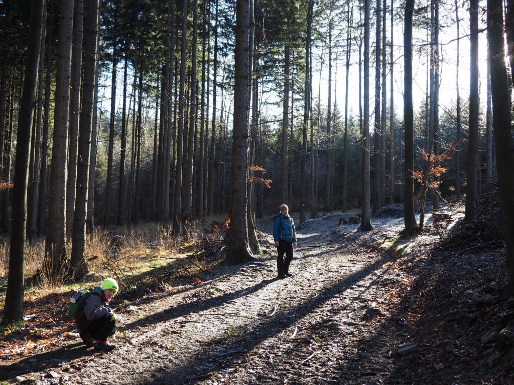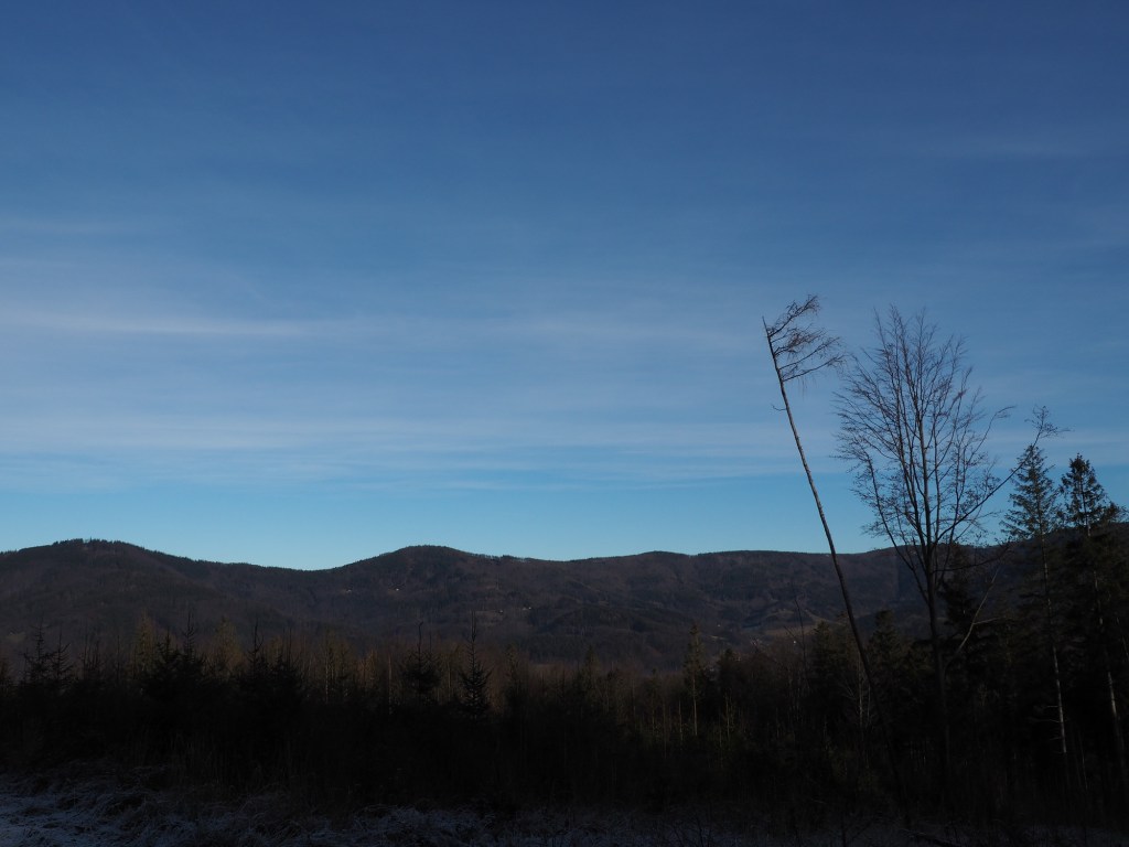Po chvilce se nám ještě znova ukázal krásný výhled na Lysou horu a pak už jsme pomalu začali kleset a asi po kilometru se napojili na modrou turistickou značku, která nás dovedla dolů k řece do Raškovic.