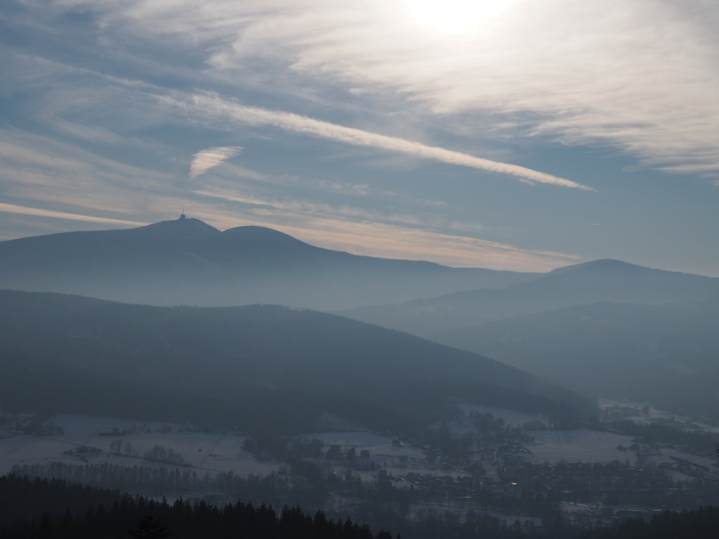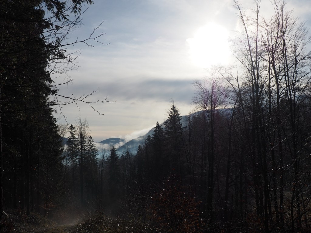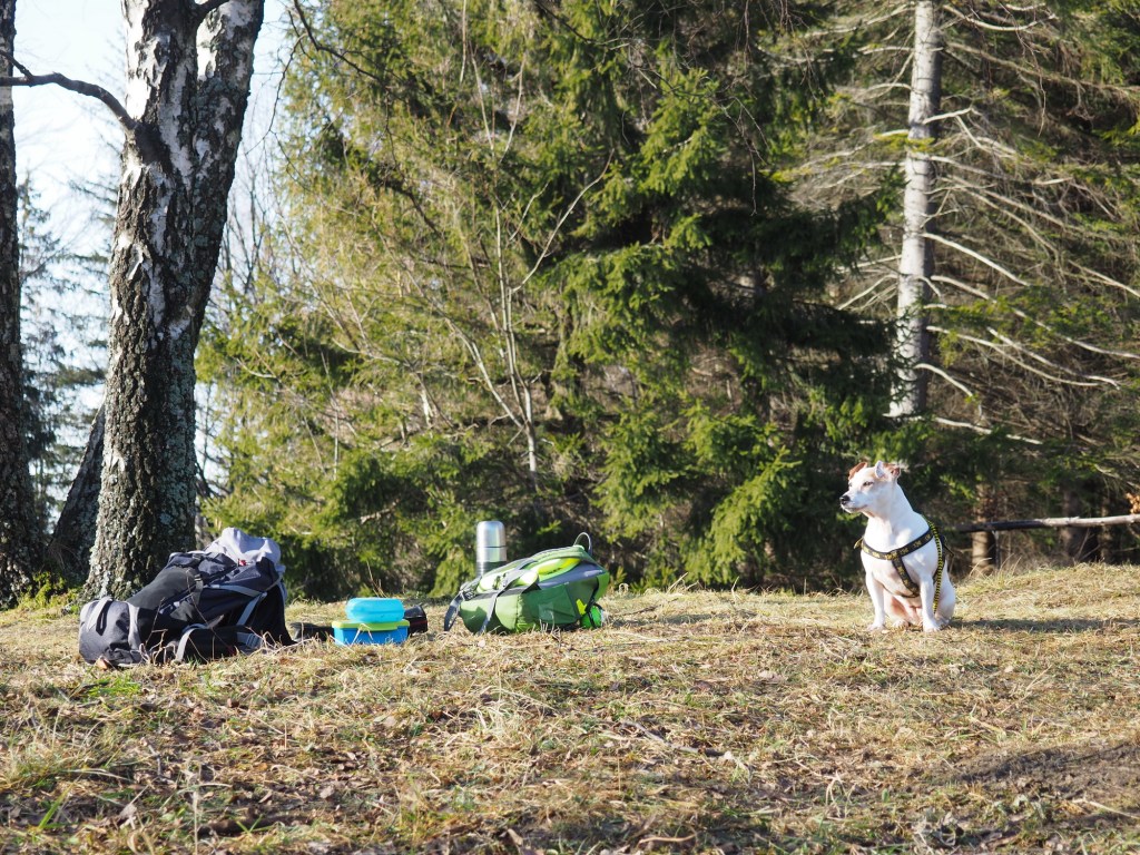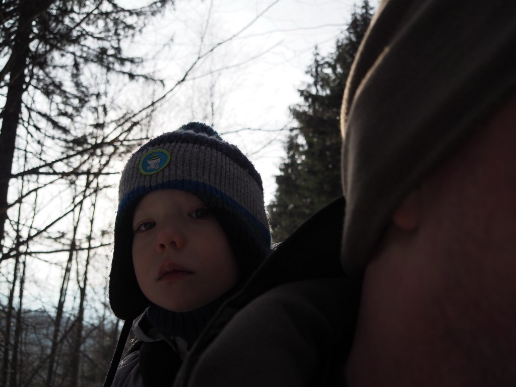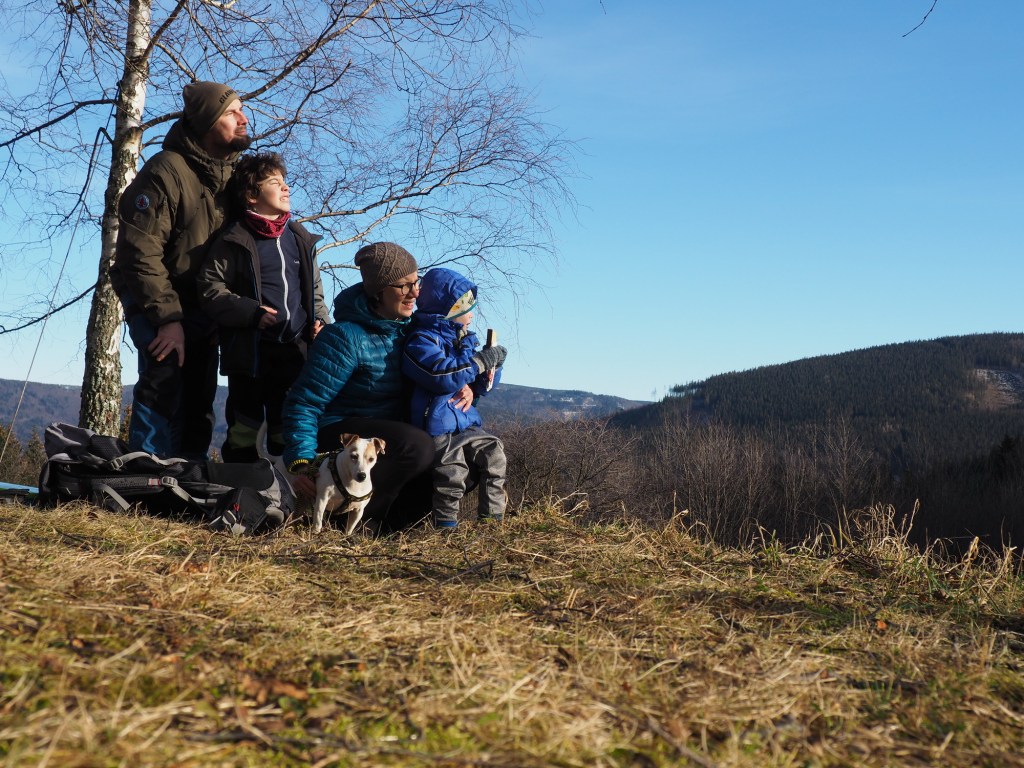 Po náročném stoupání jsme byli odměněni úžasným výhledem na Pražmo, Travný a Lysou horu. To byla panoramata. Berník už byl docela zmrzlý, takže jsme ho vytáhli z krosny a šel po svých. Bohužel cesta byla spíš neprošlapaná a šlo se mu těžko a bylo to dost zdlouhavé. Takže asi po 400 metrech šel zase zpátky do krosny.