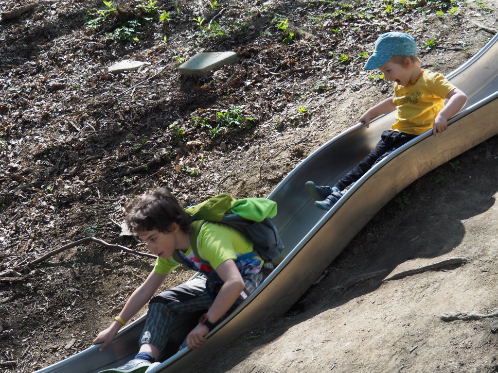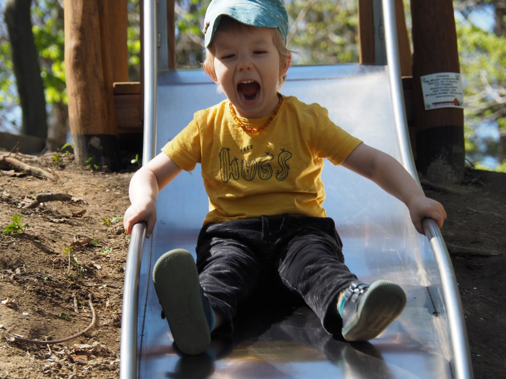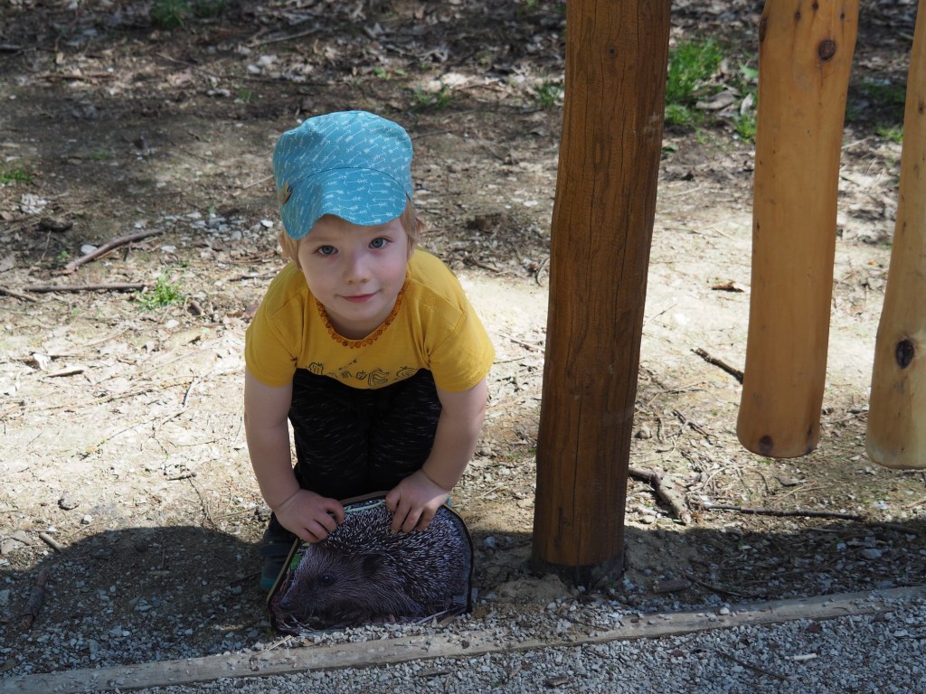 Kluci nevěděli kam dříve. Vyzkoušeli houpačky a klouzačku, a pak jsme si prošli takový malinký okruh, naučnou stezku, na které byly informační tabule se spoustou zajímavých informací a interaktivních stanovišť. V lese se taky ukrývalo spousta roztomilých zvířátek. Pak se kluci vyblbli na lanových drahách a různých opičích prolézačkách. Nejvíce je bavila dlouhá nerezová klouzačka, to jsme si my rodiče mohli jen tak posedět na lavičce a slunit se. To byla paráda. Cestou z výletu jsme se ještě stavili na zmrzlinu na Pražmo, vanilková s pistáciovou byly tou pravou sladkou tečkou za hezkým víkendem.