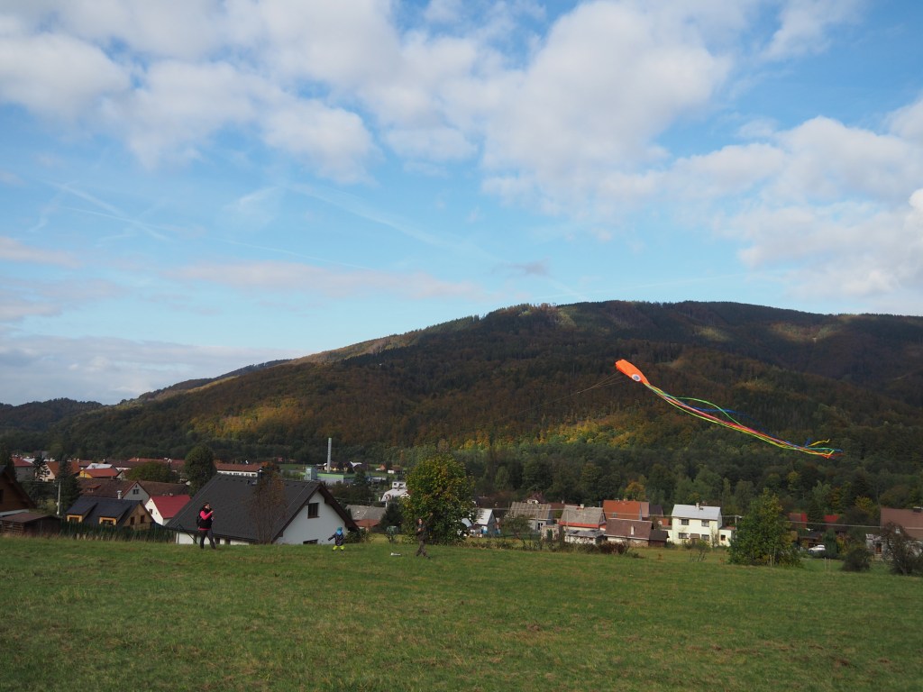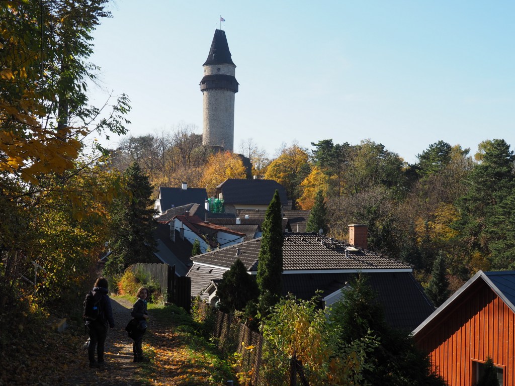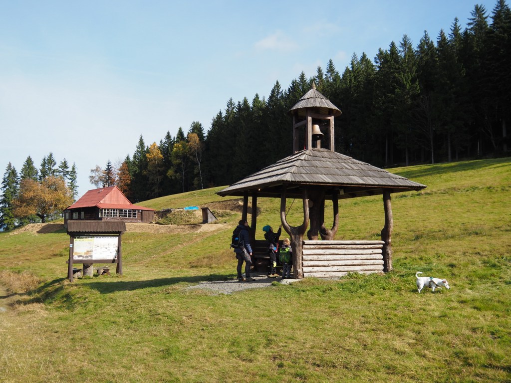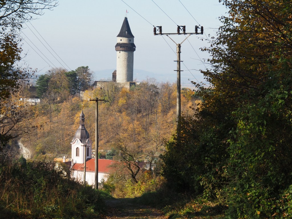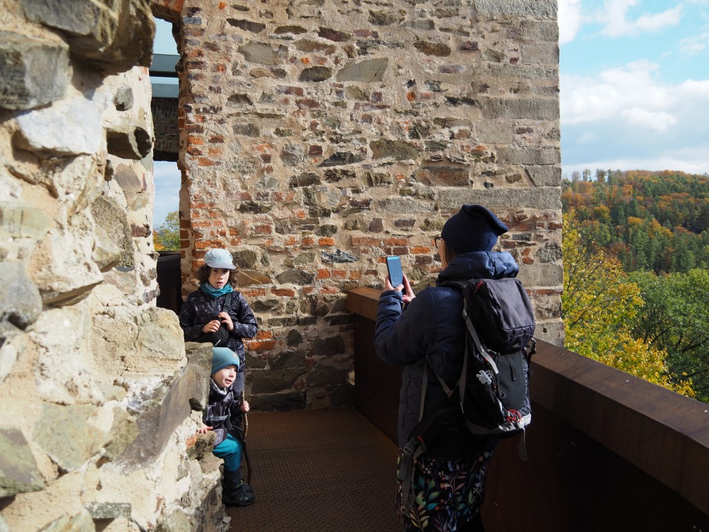 Když už jsme se nabažili tímto úžasným místem pokračovali jsme po pěkné stezce k rozhledně Bílá hora. Míša počkal s Chilli pod rozhlednou, Maki a kluci statečně zdolali všechny schody a rozhlíželi se po okolí z vrcholku rozhledny. Od rozhledny jsme pak pokračovali stezkou do samotného Štramberka. Touto cestou jsme ještě nešli a moc se nám líbila. Vyšli jsme kousek od Štramberské trúby, kde se situace opakovala – Míša a Chilli čekali dole a Maki a kluci zdolávali schody nahoru.