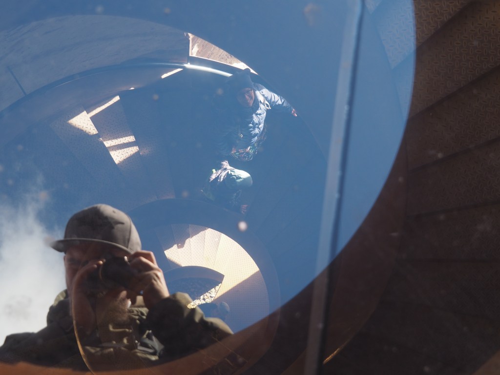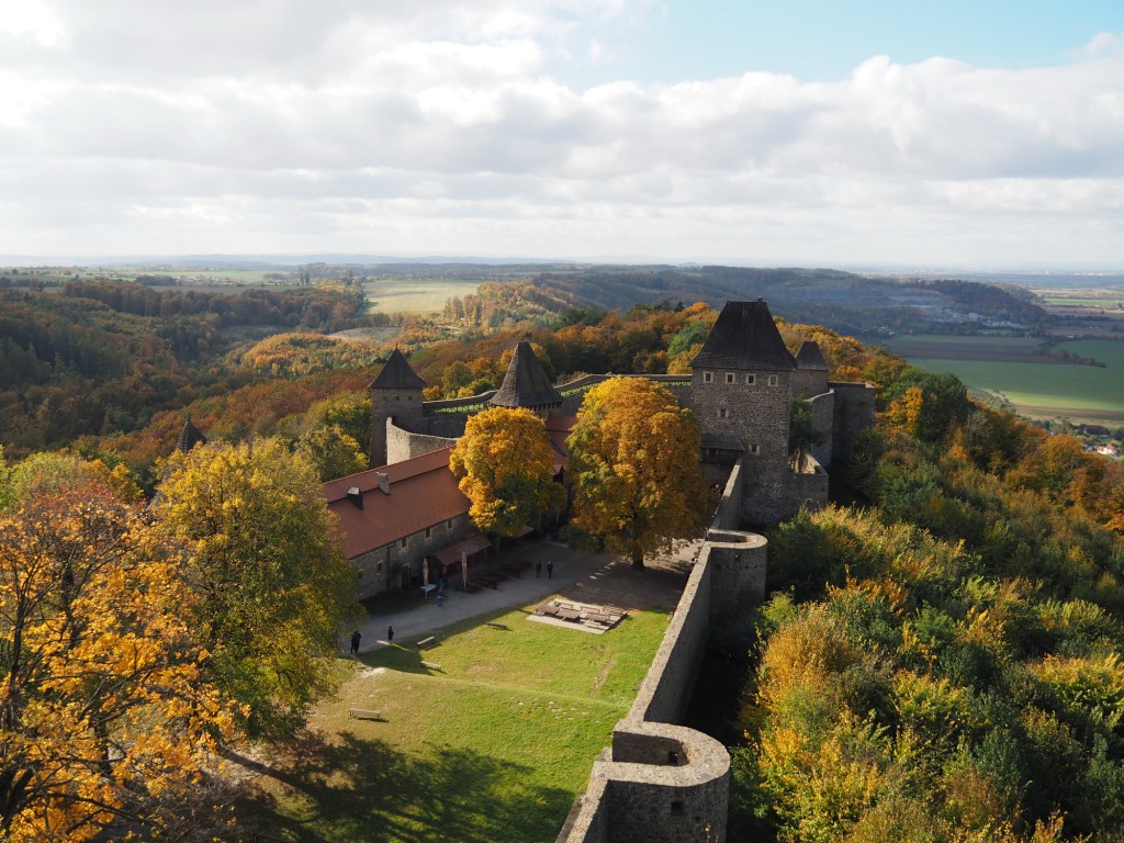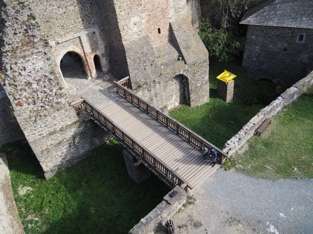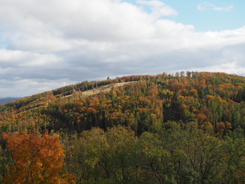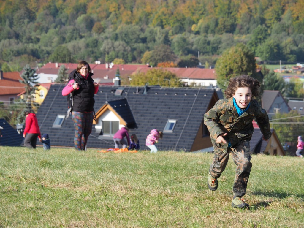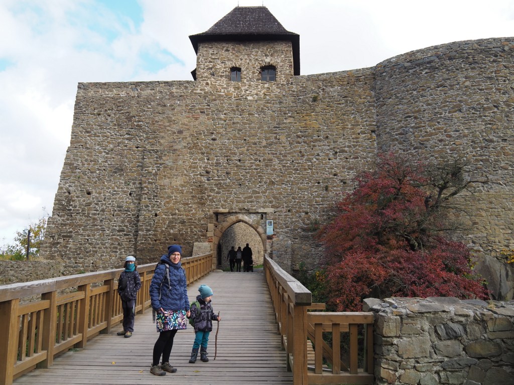Když už jsme se nabažili tímto úžasným místem pokračovali jsme po pěkné stezce k rozhledně Bílá hora. Míša počkal s Chilli pod rozhlednou, Maki a kluci statečně zdolali všechny schody a rozhlíželi se po okolí z vrcholku rozhledny. Od rozhledny jsme pak pokračovali stezkou do samotného Štramberka. Touto cestou jsme ještě nešli a moc se nám líbila. Vyšli jsme kousek od Štramberské trúby, kde se situace opakovala – Míša a Chilli čekali dole a Maki a kluci zdolávali schody nahoru.