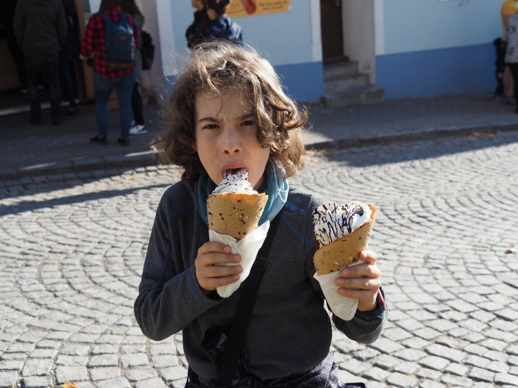 Ve Štramberku jsme si nemohli nechat ujít štramberské uši, tentokráte plněné šlehačkou. Míša a Samík měli větší uši a Maki a Berník klasické. Ty větší byly opravdu obrovské a pořádně jsme se nacpali.