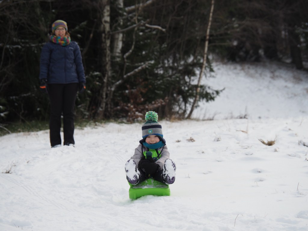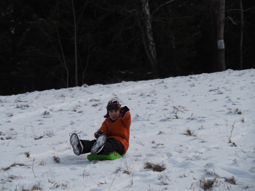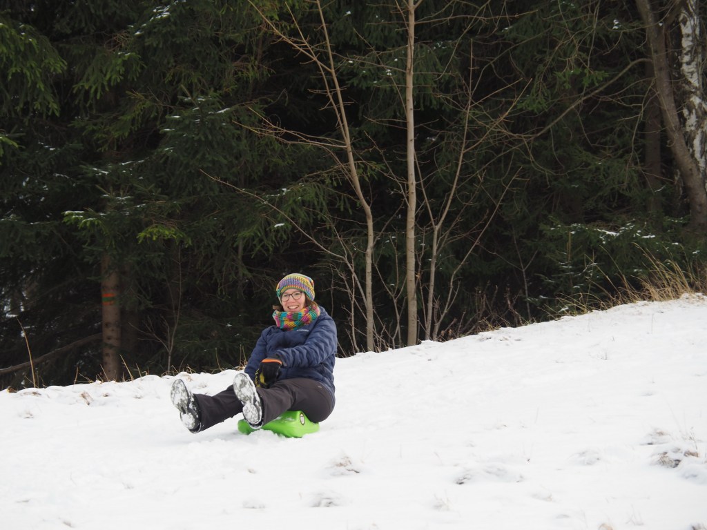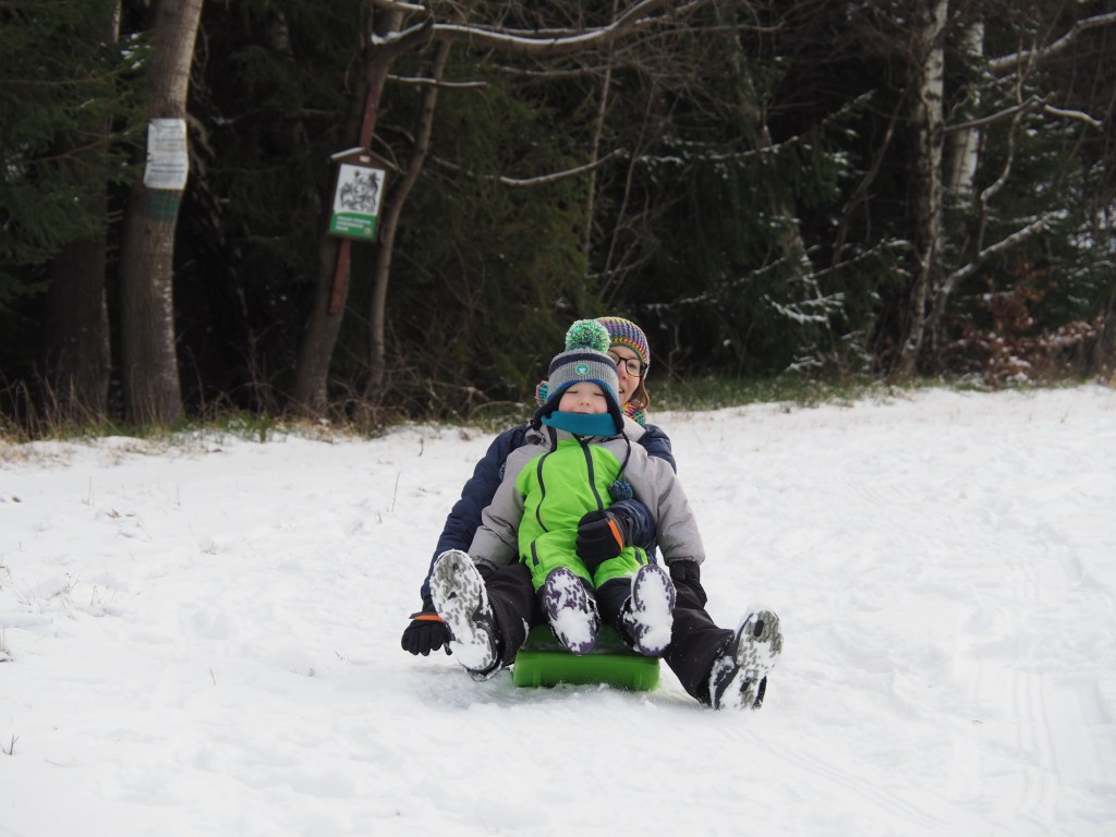 Vánoce utekly jako voda, oba vánoční svátky jsme strávili návštěvami rodiny a jezením hodně jídla, takže jsme si řekli, že v pondělí vyrazíme ten bramborový salát trošku vysportovat. Protože byl všude sníh, rozhodli jsme se, že spojíme příjemné s užitečným, a půjdeme si zabobovat. Naložili jsme takřka veškerou naší sáňkovací výbavu do Bronzíka a vyrazili na Krásnou, kde jsme zaparkovali u Rekreantu. Pak jsme vyrazili po žluté směr Přelač. Bylo to sice jen asi kilometr a půl, ale do prudkého kopce, takže nám výstup s veškerou bobovací výbavou dal docela zabrat. Ale dorazili jsme do cíle a po chvilce odpočinku vyrazili na bývalou sjezdovku jezdit. Nejlépe se osvědčily Zipfy, když Míša vyjezdil dráhu, svištěli jsme pak dolů z kopce rychlostí blesku. Když jsme se dostatečně vyřádili, nasadili jsme na nohy nesmeky a vyrazili zase dolů k autu. Byl to moc fajn dopolední výlet.