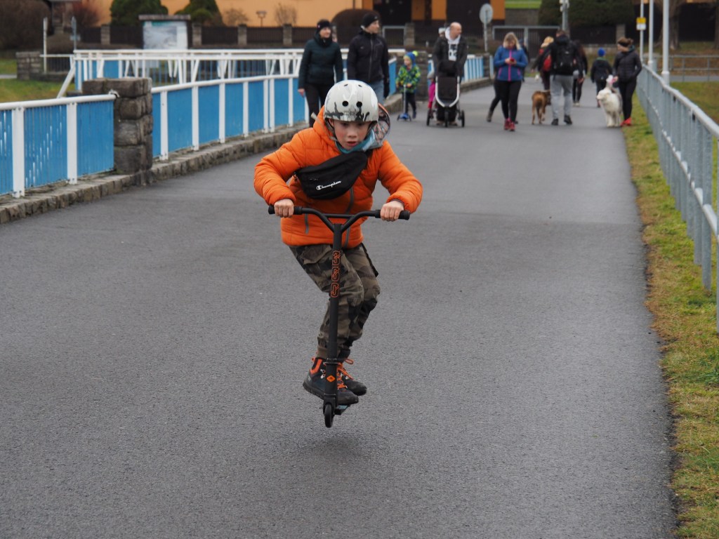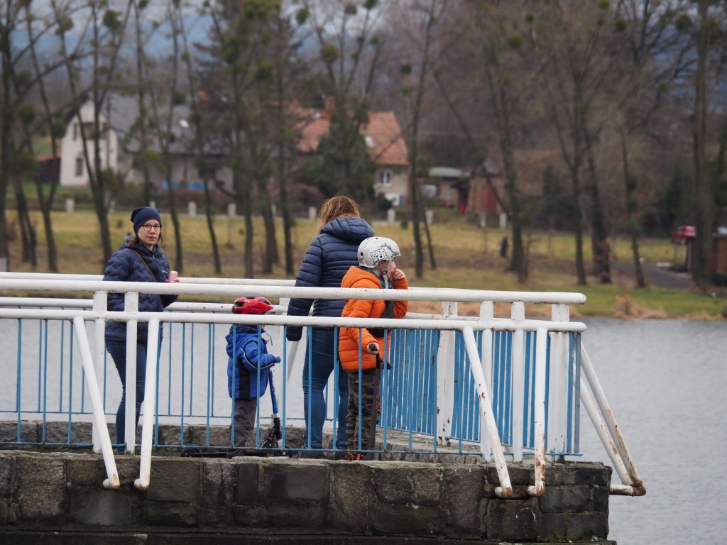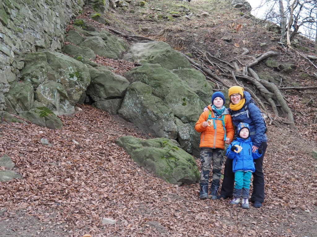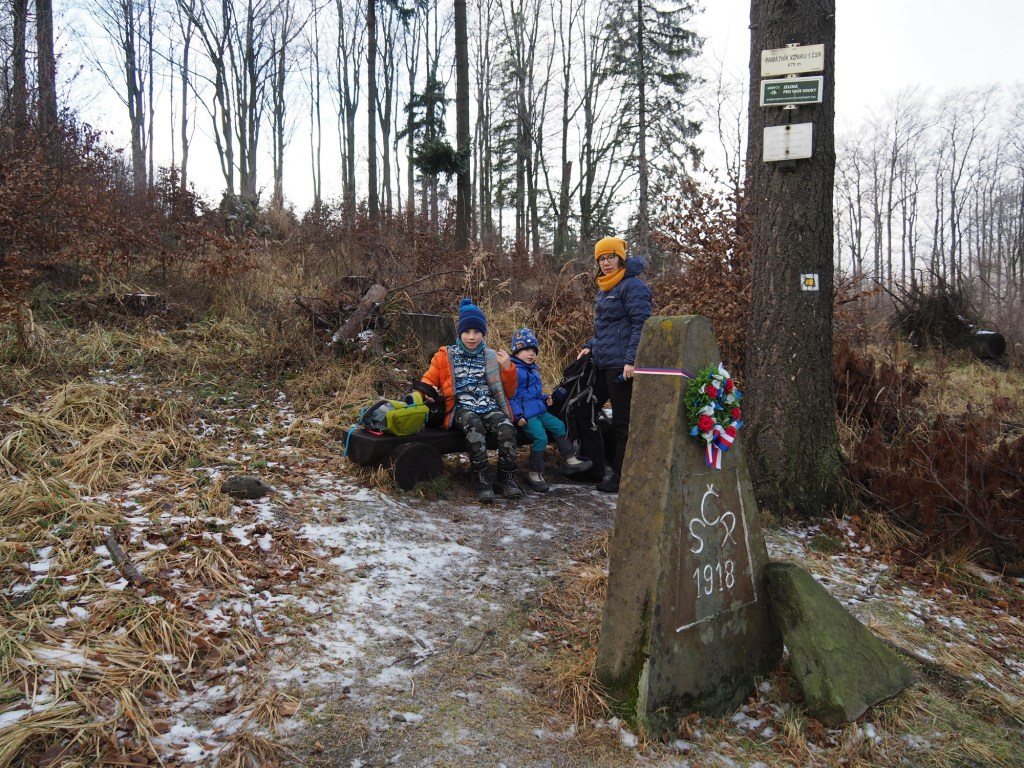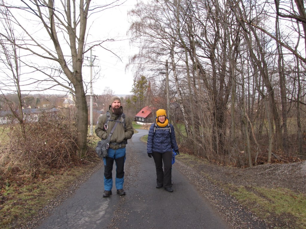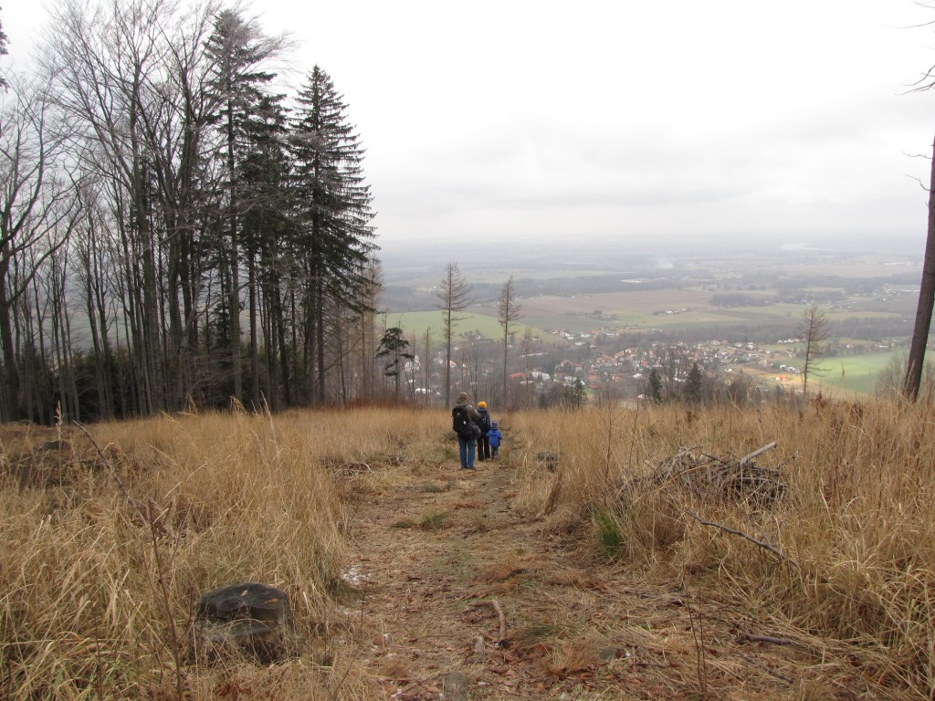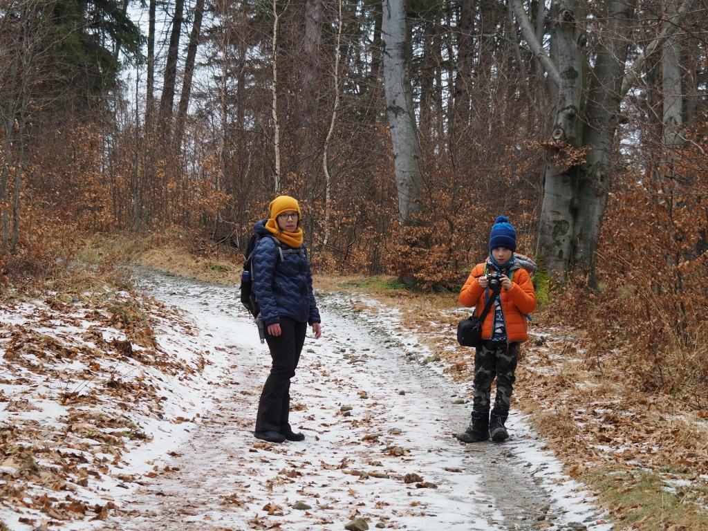 Na lavičce jsme si tam dali svačinku a teplý čaj z termosek od Ježíška. A dokonce vykouklo i sluníčko. Samík s Míšou pak ještě vyrazili odlovit kešku, kterou jsme kupodivu ještě neměli ve sbírce. Protože se nám nechtělo vracet stejnou cestou, zpátky jsme šli dál po vrstevnici a pak se prudkým klesáním napojili na asfaltku o kus níže před rekreačním střediskem. Pak už jen zase projít kolem obou kostelů a už jsme byli zpátky u auta.