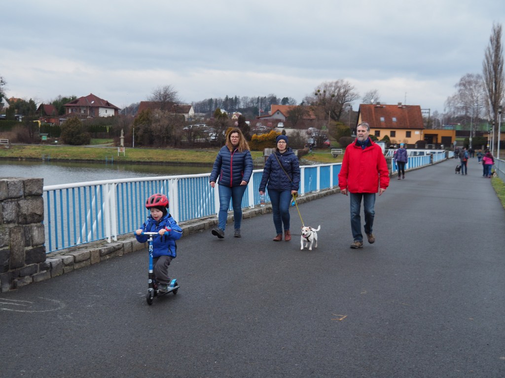 Autem jsme to do Komorní Lhotky měli kousíček, Bronzíka jsme zaparkovali na parkovišti u kostela a vyrazili po žluté. Ušli jsme pár kroků a Berník nás přemluvil, ať se jdeme podívat na starý hřbitov u kostela. Kousek dále po trase jsme ještě udělali přestávku i u evangelického kostela a pak už jsme vyrazili vzhůru do kopce. Celou cestu nás doprovázel pes tulák, který tak různě poletoval mezi všemi turisty. Říkali jsme si, že je dobře, že Chilli zůstala doma, byla by z něho nervózní a my taky.