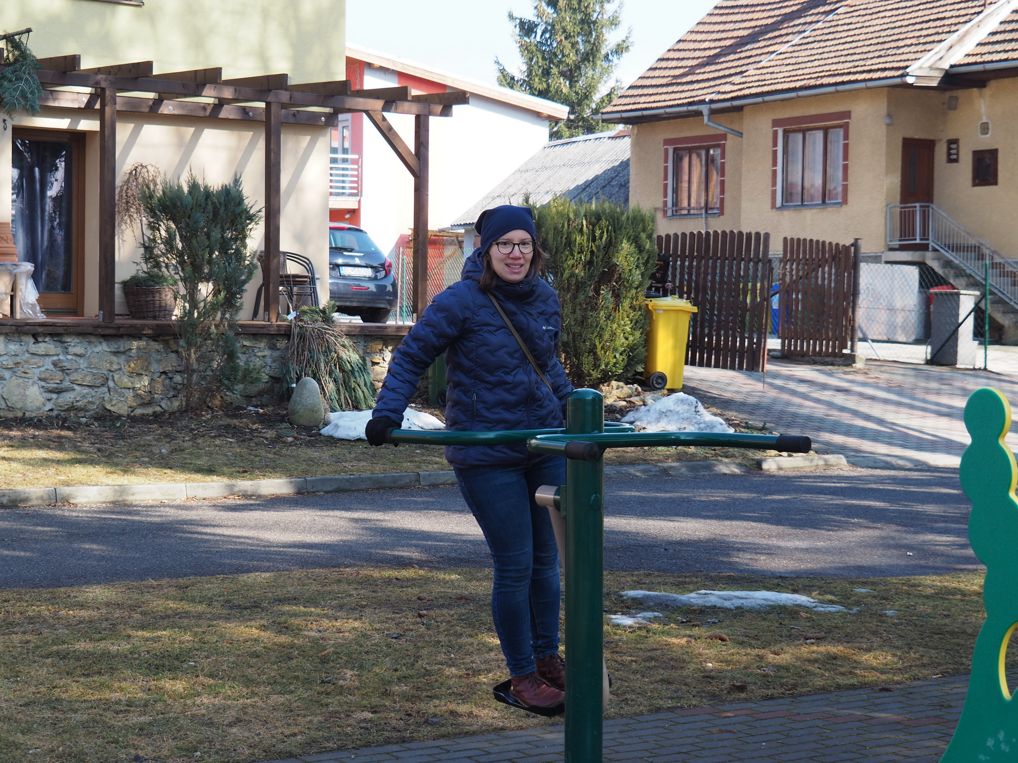 Po snídani jsme se šli trošku projít po Bešeňové, aby nám před koupáním trochu vytrávilo. Došli jsme až k ubytování Apartmány Dreams, kde jsme na jedné z předchozích návštěv Bešeňové bydleli. Zpátky jsme to vzali kolem řeky, odlovili kešku a objevili workoutové hřiště, kde jsme se trošku protáhli.