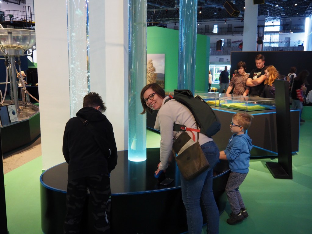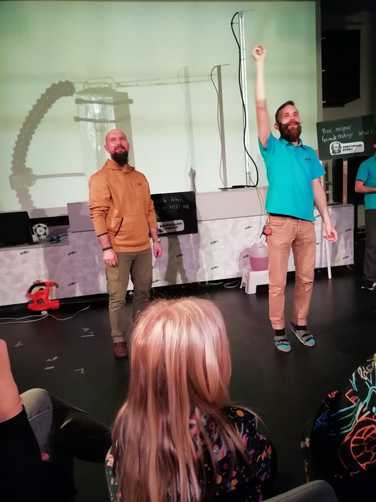 Vyrazili jsme brzy ráno, Chilli zavezli k tetě Lucce a chvilku po desáté už jsme parkovali u brněnského výstaviště. Šli jsme podle šipek k pokladnám výstavy Faraon, ale na pokladně jsme zjistili, že se prodávají vstupenky až na 13 hodin 😦 Tak to byla čára přes rozpočet. Ale poradili jsme si s tím, lístky jsme koupili a šli jsme navštívit i vedlejší science centrum Vida. Dali si věci do šatny a vyrazili prozkoumat všechny exponáty. Kluci nevěděli kam dříve, tolik super věcí, které všechny vysvětlovaly různé fyzikální jevy a úkazy. V 11 začínala v divadélku show, takže jsme se tam přesunuli a dobře udělali, protože jsme se dozvěděli spoustu zajímavých věcí o aerodynamice. Dokonce byl náš taťka vybrán na jeden pokus 🙂 Moc jsme mu fandili a vyhrál. Potom kluci a v omezené míře i my pokračovali v prozkoumávání toho, co centrum nabízelo. Ale čas neúprosně běžel a my se museli přesunout zpět k Tutanchamonovi.