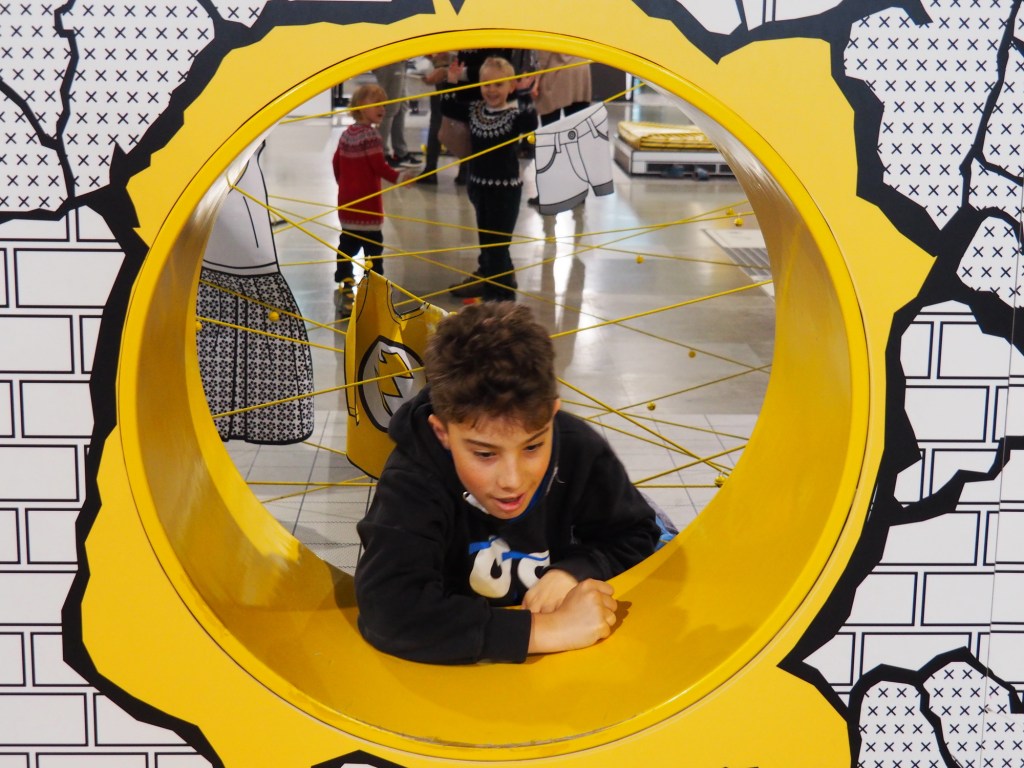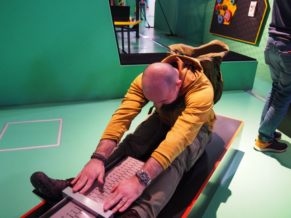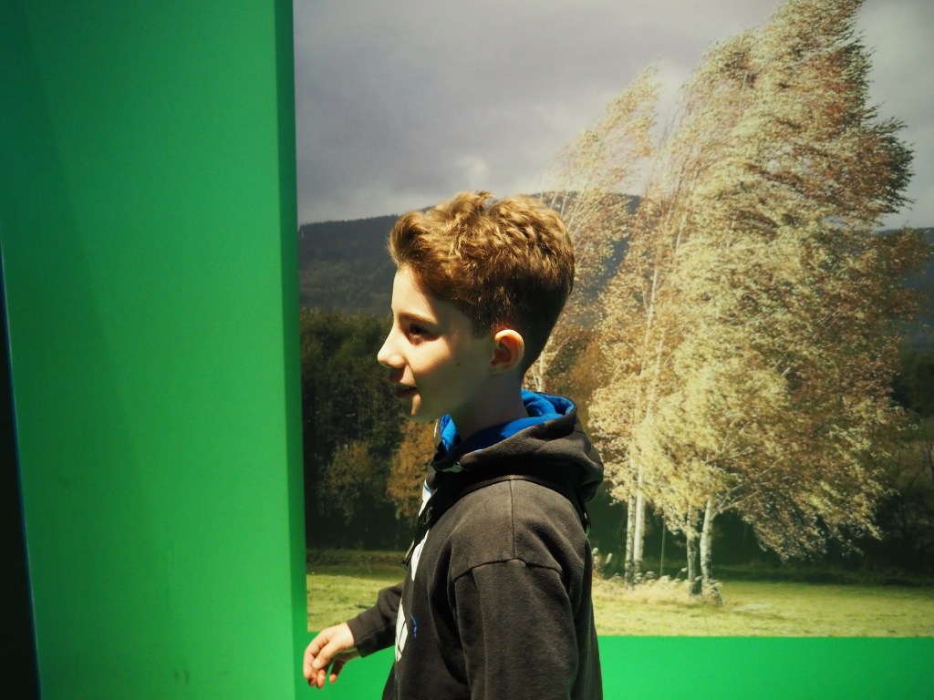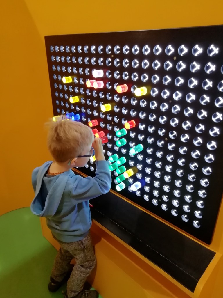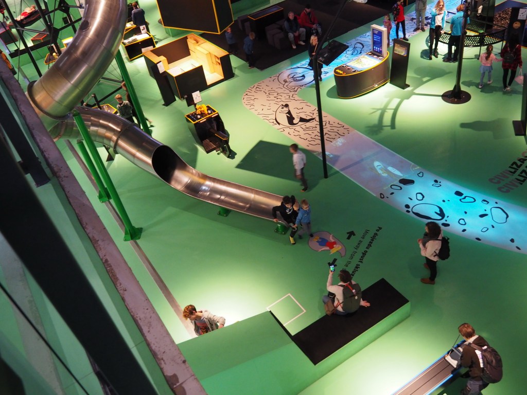 Když jsme přicházeli, od vstupu se táhla docela dlouha fronta, zařadili jsme se teda nakonec a čekali. Po půl hodině, když už jsme byli takřka na řadě, koho nevidíme. Naše sousedy z Raškovic, kteří byli frontou stejně šokování jako my před chvílí. Zdravíme se a smějeme se té náhodě. Ale to už jsme vpuštěni dovnitř. V šatně necháváme bundy, bereme si audioprůvodce (jen my dospělí, což se za chvíli ukázalo jako chyba) a vstupujeme na výstavu.