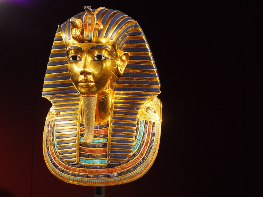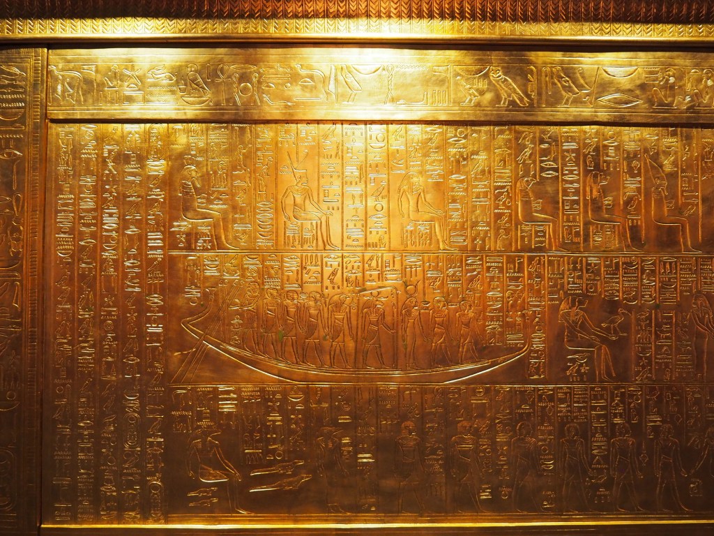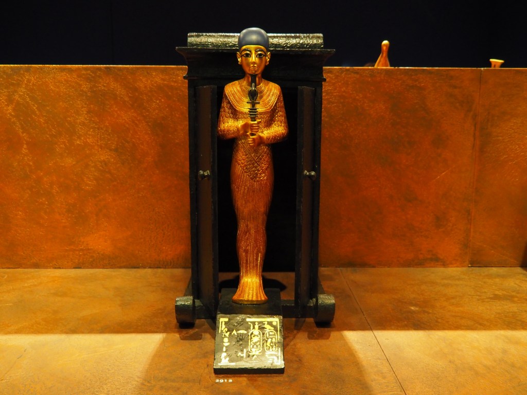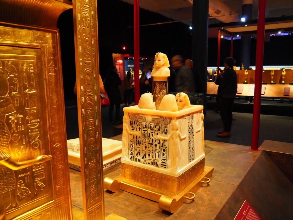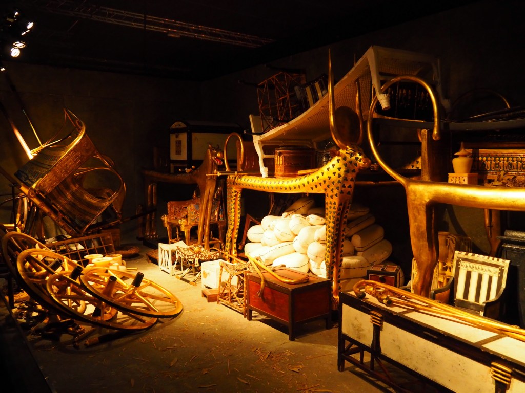 Po krátkém čekání jsme tedy vpuštění do další místnosti, kde je nám promítnuto video a zvuk jde jenom do audioprůvoodců, takže si je tak různě střídáme. Pak už jdeme do místnosti, ve které je ukázka z hrobky – pohled, jaký se jako první naskytl objevitelům a samotná hrobka se sarkofágem. Pak už naštěstí postupujeme volně svým tempem a kocháme se nádhernými replikami všech artefaktů z hrobky faraona Tutanchamona. Nakonec se nám výstava moc líbila, jen litujeme, že jsme si vybrali špatný den a museli se prodírat mezi hodně lidma. Ale i tak to bylo moc hezké a poučné. Věříme, že se to Samíkovi bude hodit do hodin dějepisu.