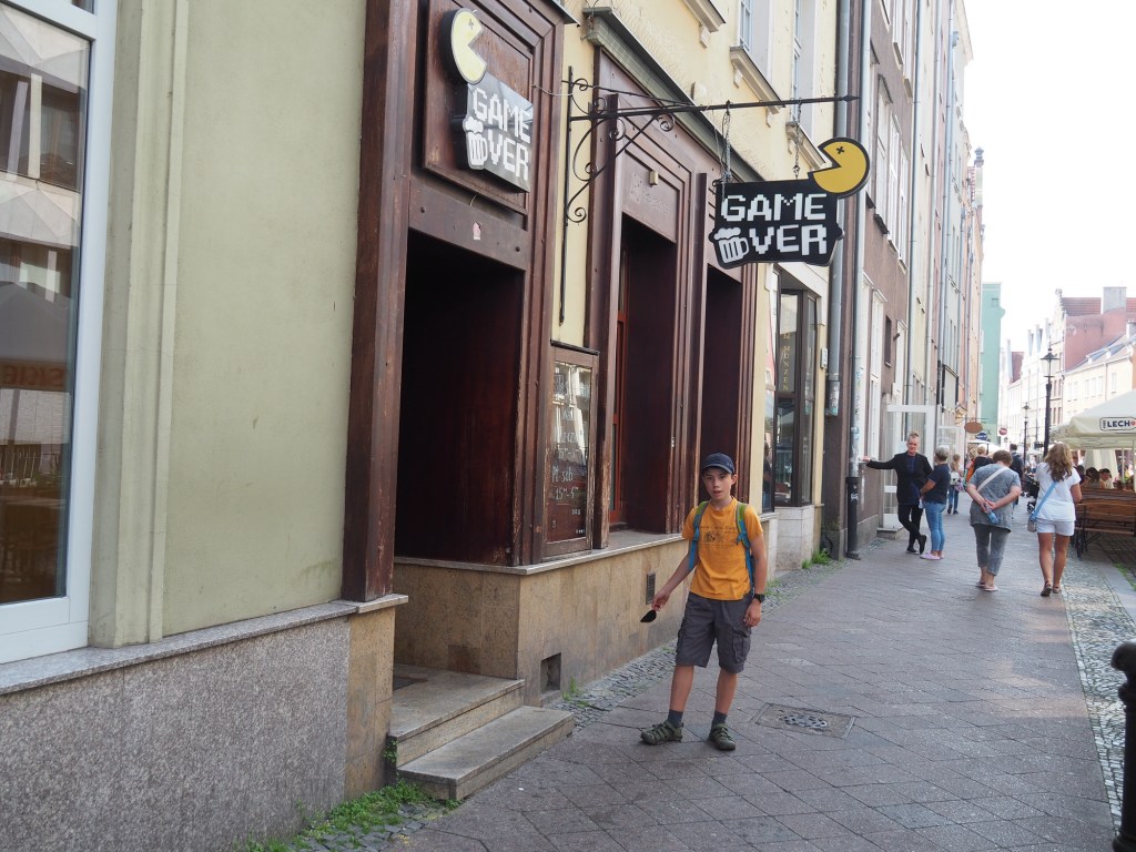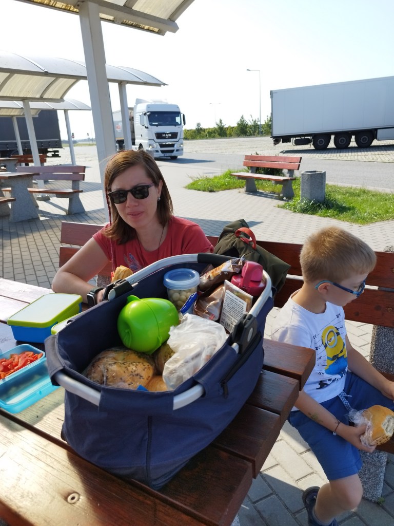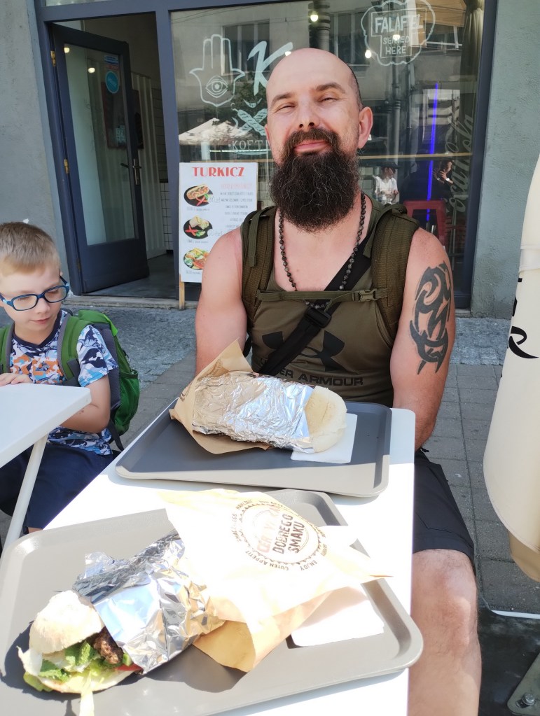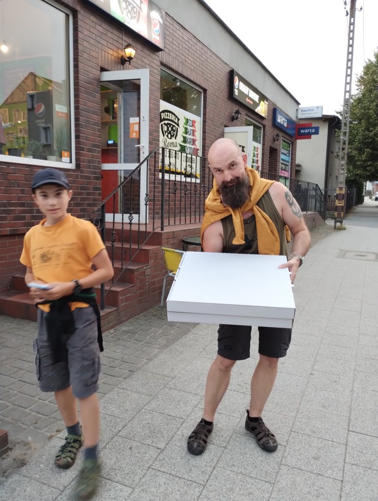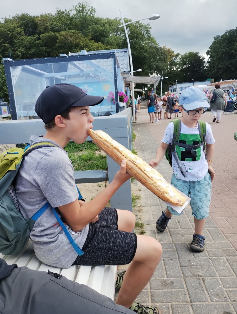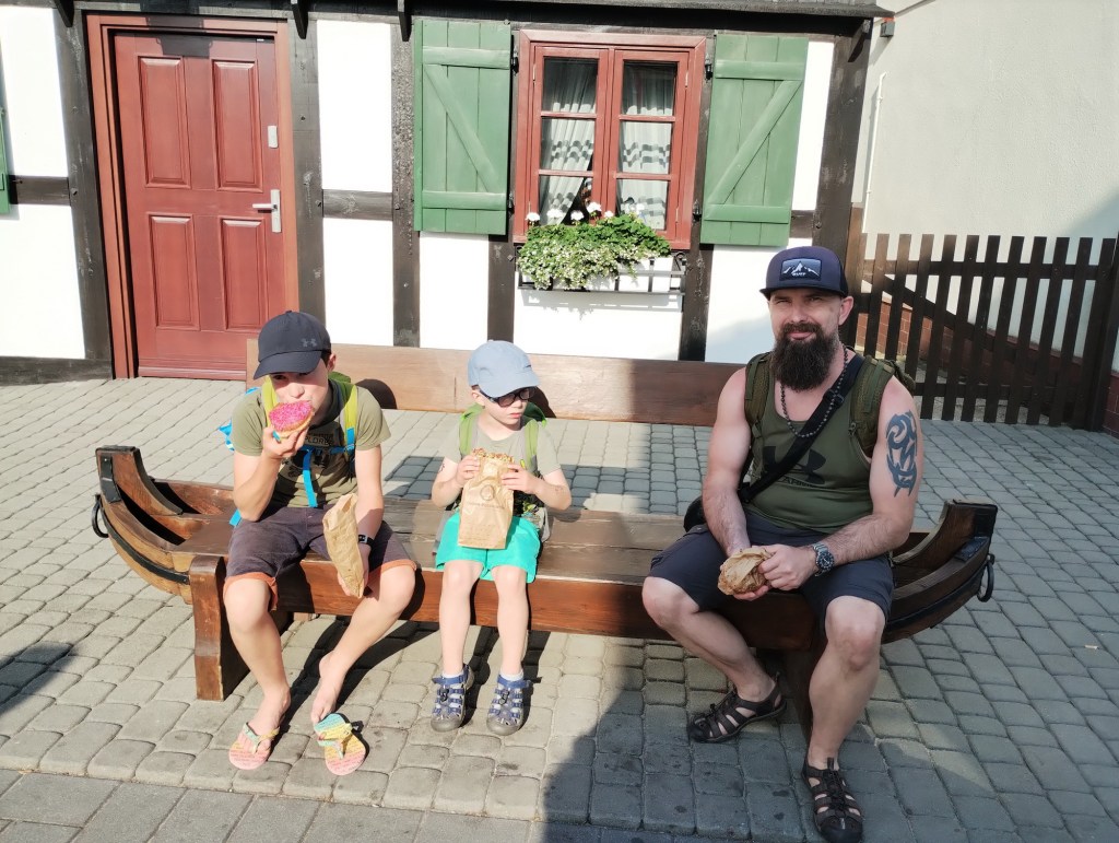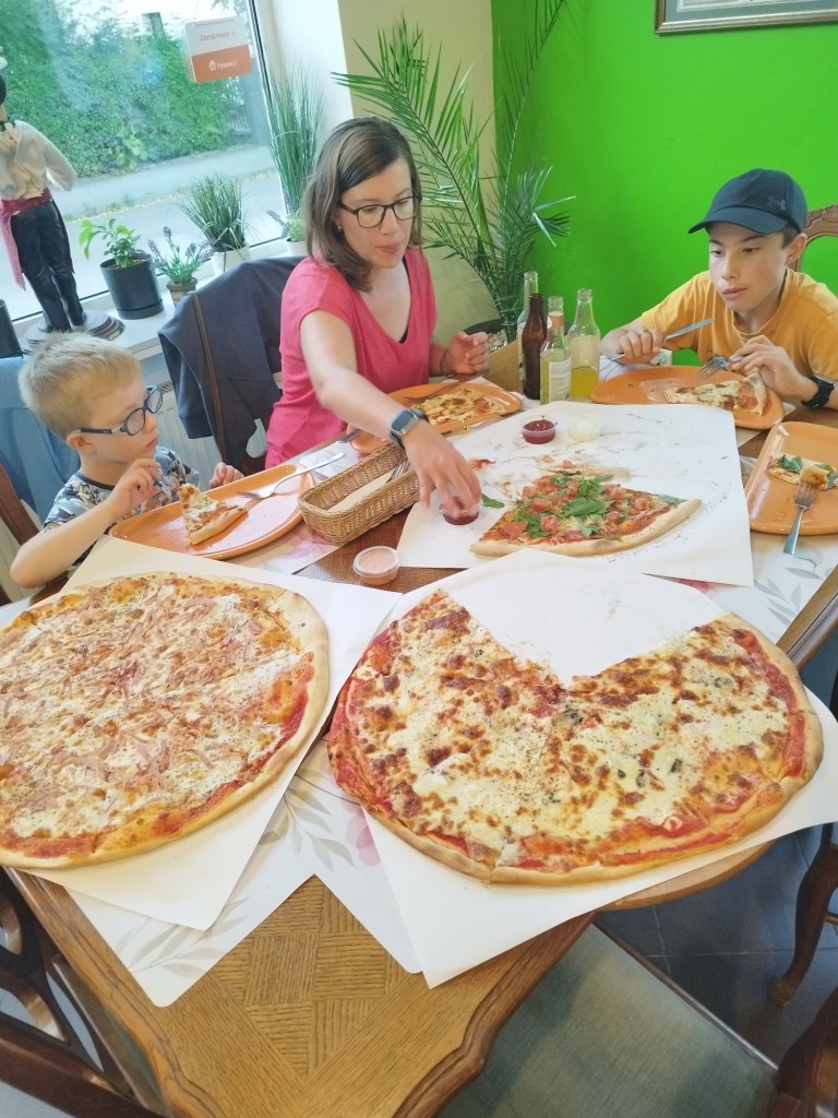 Po prohlídce jsme se vydali stejnou cestou zpět. Kluci nasadili ďábelské tempo a tak nám to rychle uteklo. V Pucku si pak Samík dál zapiekanku (salami – sýr, žampiony, salám, cibule) bez žampionů a cibule. My jsme pak pokračovali do restaurace Maka I Woda, kde si Míša a Berník dali pirožky a Maki bramboráčky s vynikající žampionovou omáčkou. Míšovi to nestačilo a tak si dal jako dezert palačinky s pečenými jablky. Mňam!
