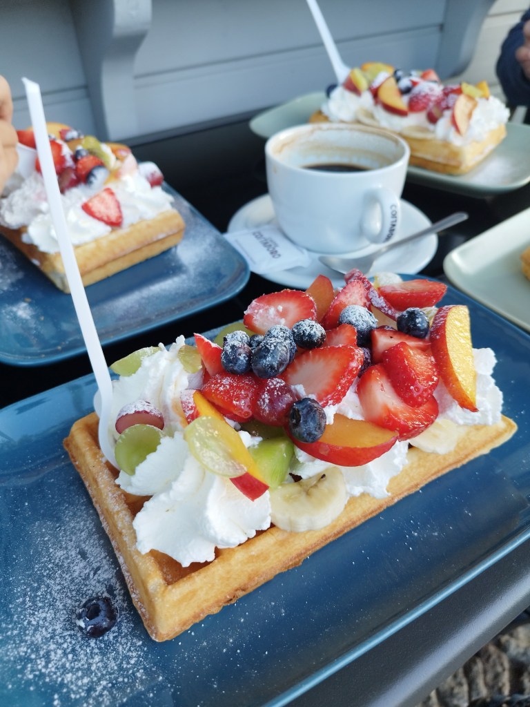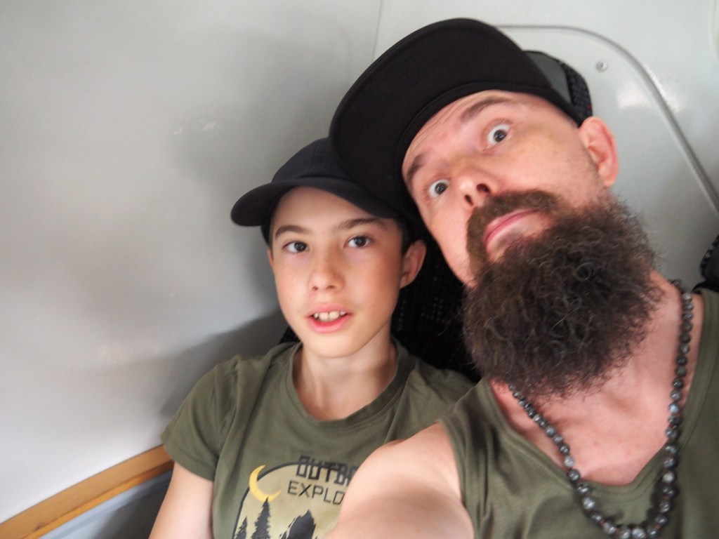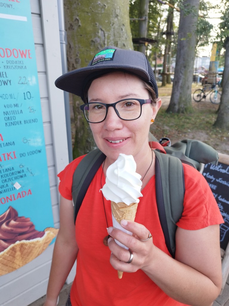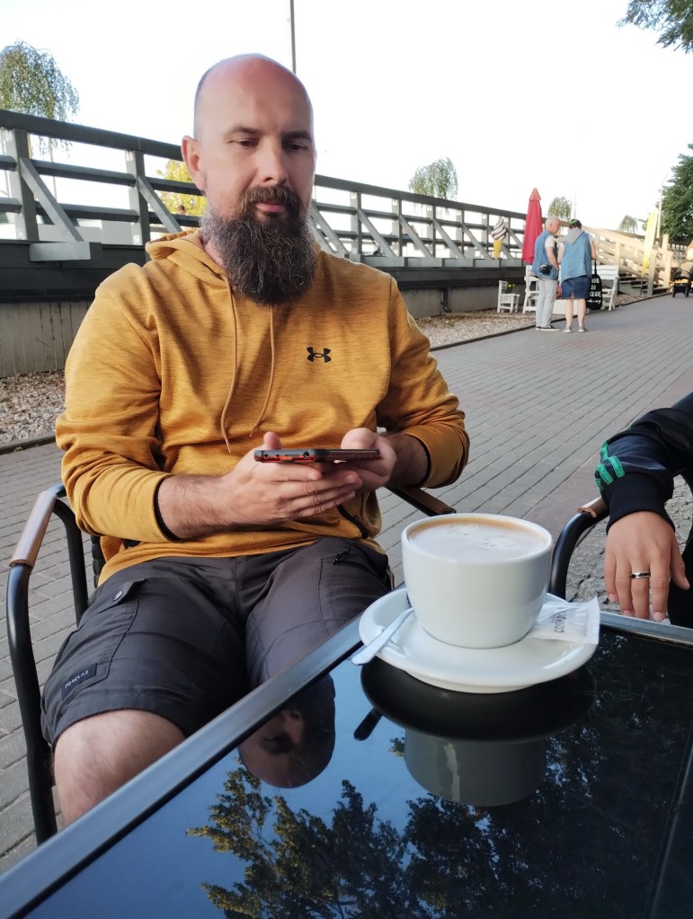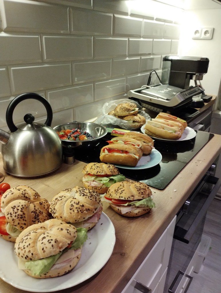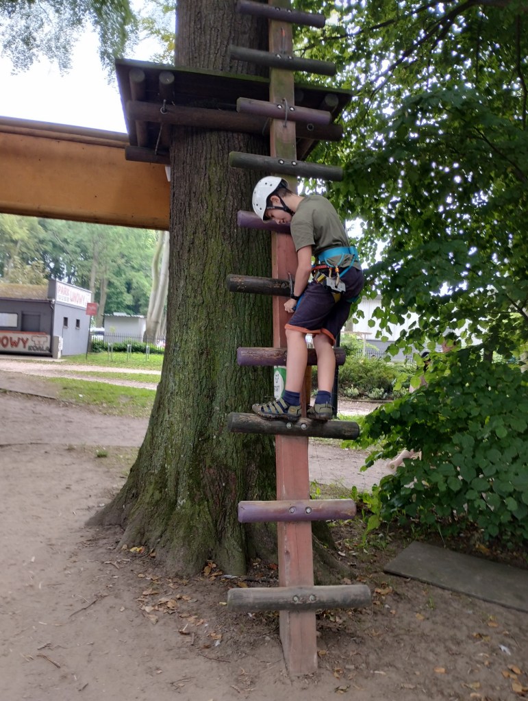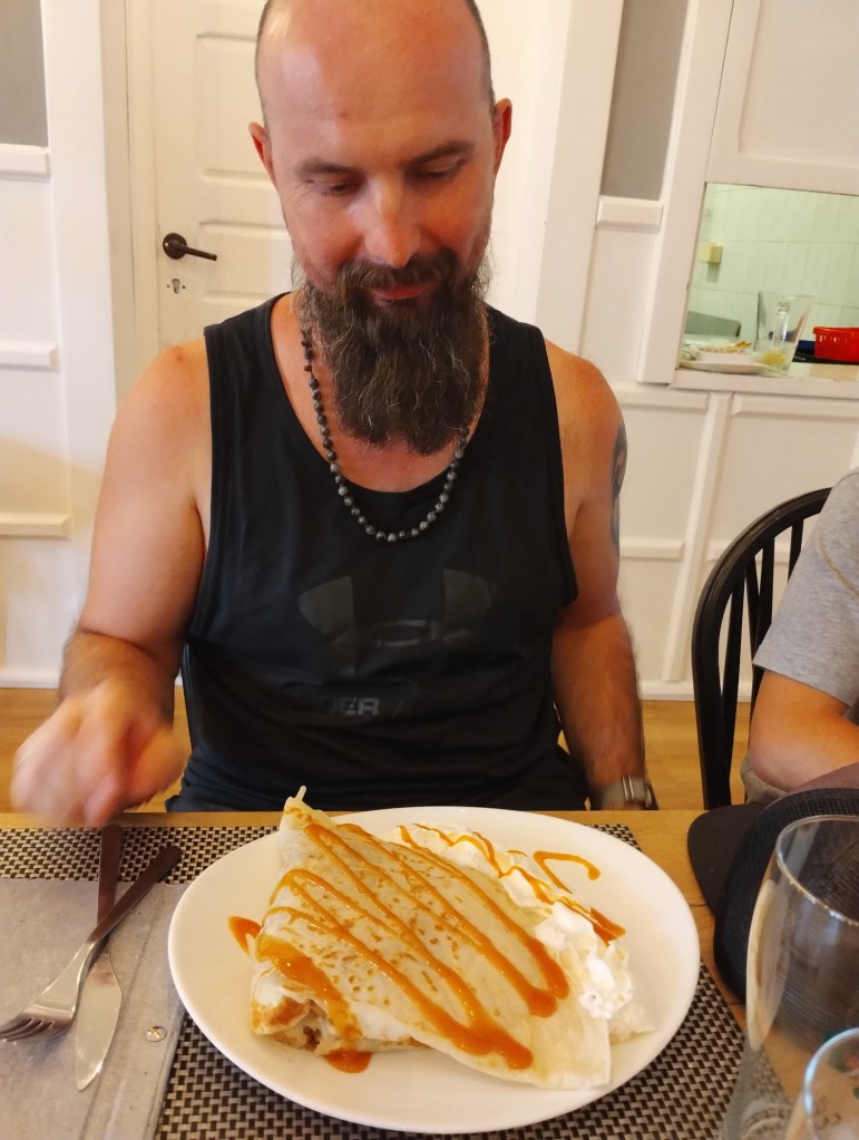 Po prohlídce jsme se vydali stejnou cestou zpět. Kluci nasadili ďábelské tempo a tak nám to rychle uteklo. V Pucku si pak Samík dál zapiekanku (salami – sýr, žampiony, salám, cibule) bez žampionů a cibule. My jsme pak pokračovali do restaurace Maka I Woda, kde si Míša a Berník dali pirožky a Maki bramboráčky s vynikající žampionovou omáčkou. Míšovi to nestačilo a tak si dal jako dezert palačinky s pečenými jablky. Mňam!