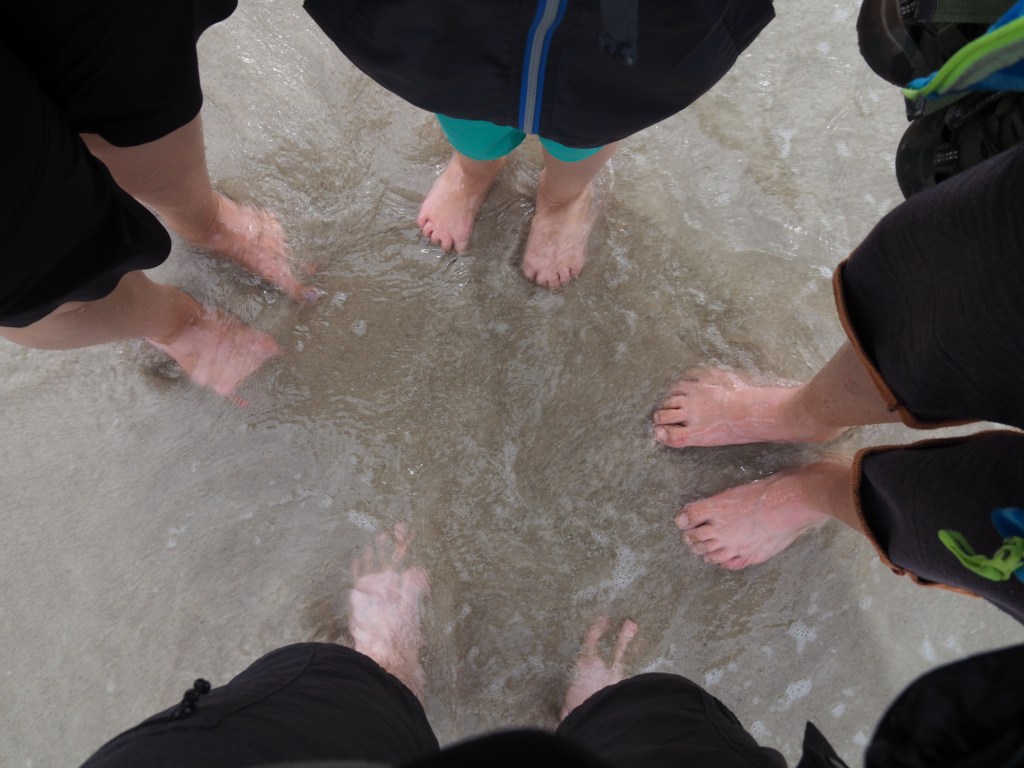 No byla to vlastně cesta po úzké pláži podél moře. Úzké myslím opravdu úzké, písek byl podmáčený, kolikrát voda zasahovala daleko tak, že se stezka obtížné přecházela suchou nohou. Berník, který jde a nedívá se kam šlape, za chvíli stál ve vodě a ani mu nevadilo, že mu teklo do bot. Vzdali jsme to a vrátili se na cyklostezku.