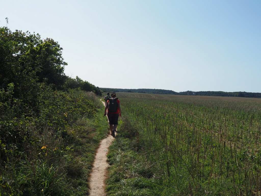 Cyklostezka vedla kousek od turistické trasy, ale to jsme zjistili až později. Pokračovali jsme stezkou z města do polí a k tomu nám krásně svítilo sluníčko. Maki byla trochu nervózní, představovala si romantickou pěšinu s výhledem na moře, což cesta polem s občasným oknem na moře v keřích a stromech lemujícími stezku nebyla. Kluci se taky netvářili a divili se proč jsme nejeli autem, nadávali na vosy, písek a podobně.