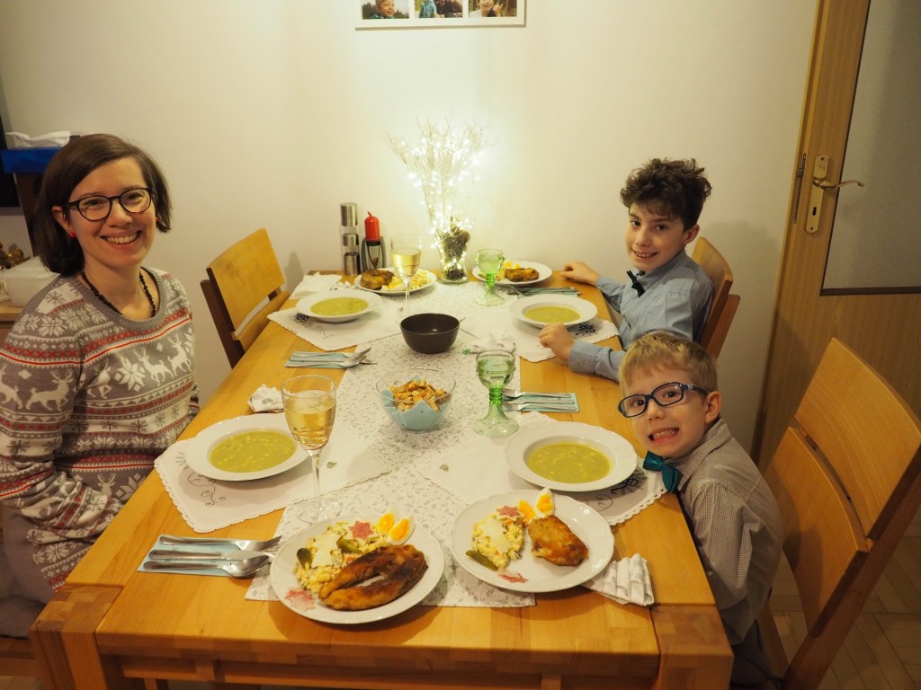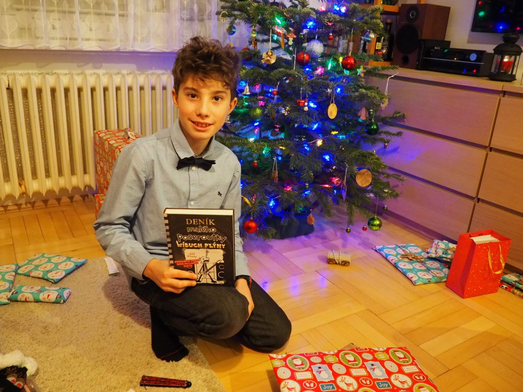Kluci byli celí nedočkaví a já začala pomalu připravovat vše na štědrovečerní večeři. Kolem čtvrté hodiny odpoledne jsme se svátečně oblékli, prostřeli na stůl a užili si výborné jídlo. Letos to bylo tradiční – hrachová polévka a kapr s bramborovým salátem. Kluci měli filetu. Po večeři jsme se vydali vyčistit zuby a pak zpívat koledy, abychom dali Ježíškovi znamení, že už ho vyhlížíme. Po chvilce se ozval zvoneček… Už je to tu… Klukům se rozzářily oči a nedočkavě utíkali do obýváku. Byly tam… Pod stromečkem nás čekalo plno dárečků a tak jsme se nedočkavě vrhli na rozbalování. To bylo štěstí a radosti. Bernášek dostal krásné divadlo a Samíkovi se splnil sen v podobě Playstationu.